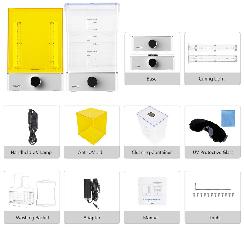 Elegoo Mercury XS — это компактный, но функциональный комплект для постобработки фотополимерных моделей, объединяющий мойку и УФ-камеру полимеризации в единую синхронизированную систему. Он позволяет быстро и качественно промыть, высушить и полностью отвердить напечатанные изделия — даже крупные.