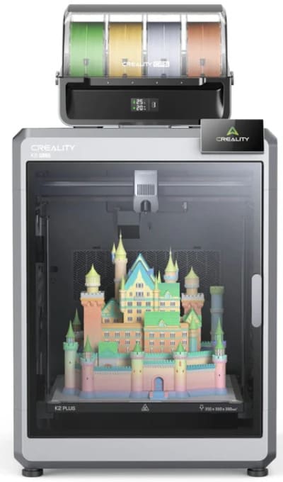 3D-принтер Creality K2 Plus Combo — новинка 2025 года, построенная на профессиональной платформе K2. С рабочей зоной 350 × 350 × 350 мм, максимальной температурой сопла 350 °C и нагреваемым столом до 120 °C, он предназначен для печати инженерных и высокотемпературных материалов. В комплект входит система автоматической смены филамента CFS и активная термокамера с подогревом до 60 °C.
