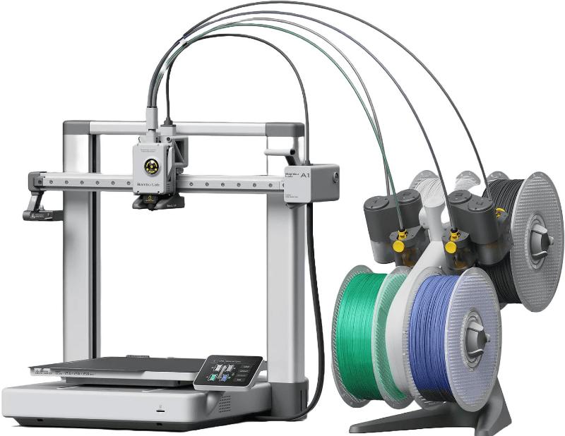 В комплект входит интеллектуальная система автоматической подачи материалов Bambu Lab AMS, позволяющая печатать с четырьмя разными филаментами без ручного вмешательства. Благодаря автоматической загрузке и разгрузке нити смена материала происходит незаметно для пользователя. Для экономии места AMS крепится сверху на раму принтера с помощью специального кронштейна, сохраняя компактность всей установки.