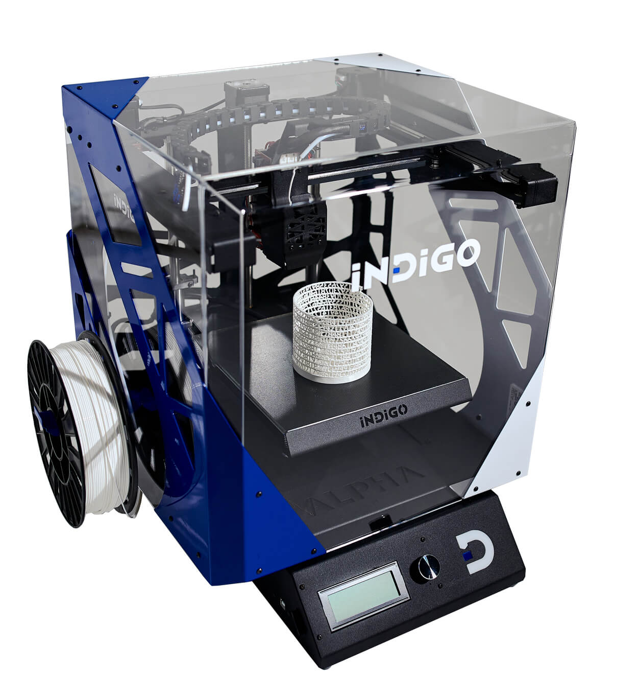3D принтер INDIGO Alpha в принтер установлен экструдер типа директ, что позволяет без проблем печатать как стандартными материалами так, но и гибкими материалами. Покрытие у печатного стола осуществляет надёжное сцепление модели во время печати и практические ситуаций, когда надо применять дополнительный средства для повышения адгезии. Рама принтера стальная с высокой жесткостью, прочностью и минимальной вибрацией. Благодаря тому что корпус принтера сделан из акрила, принтер получился облегчённым.