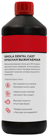Фотополимер SMOLA Dental Cast - выжигаемый стоматологический полимер. Материал предназначен для создания форм для последующего изготовления имплантов, мостов и коронок.