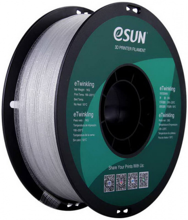 eTwinkling — представляет собой дизайнерскую разновидность пластика PLA от eSUN. Это один из самых подходящих материалов для смелых творческих экспериментов. Его главное отличие от стандартного PLA — в фактуре поверхности. Она даёт лёгкое мерцание при попадании на неё света.