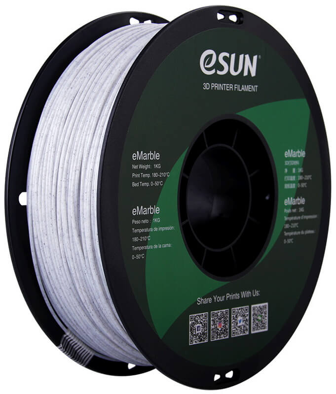 eMarble пластик eSUN для 3D принтера — это фирменная пластиковая нить от Shenzhen Esun Industrial Co. Ltd. Компания действует на рынке с 2002 года и в настоящий момент выпускает огромное количество расходных материалов и дополнительного оборудования для 3D-печати. В ассортименте компании есть как различные варианты биоразлагаемых полимеров PLA и PCL для домашнего использования, так и инженерные термопласты высокого уровня, включая полиэфирэфиркетон (PEEK), ряд угленаполненных и стеклонаполненных филаментов: ABS, полиамид (нейлон), PA6 (капрон) и множество других. Также eSUN выпускает линейку фотополимерных смол, вспомогательную химию и клеи.