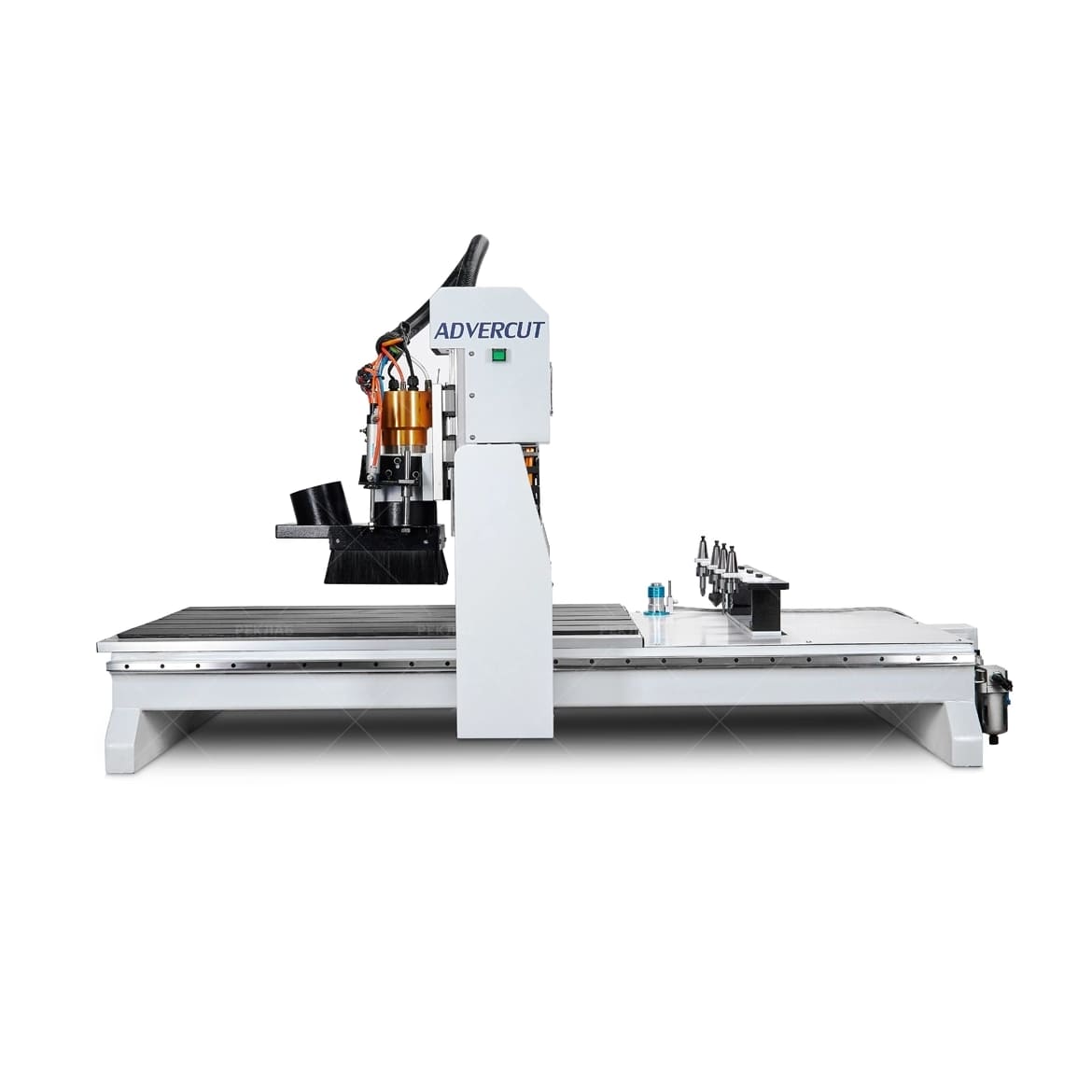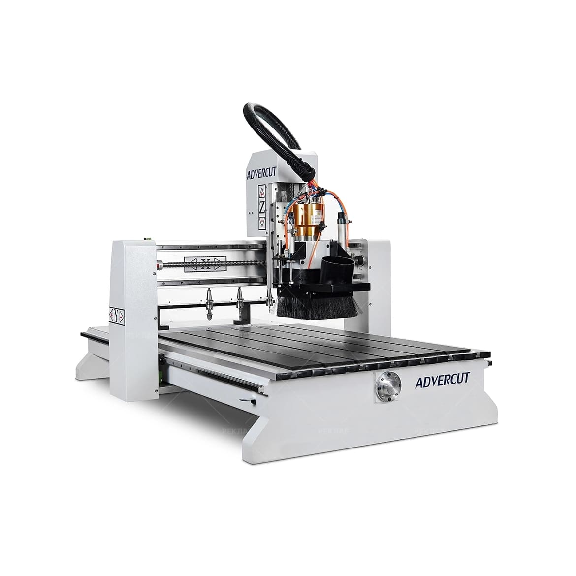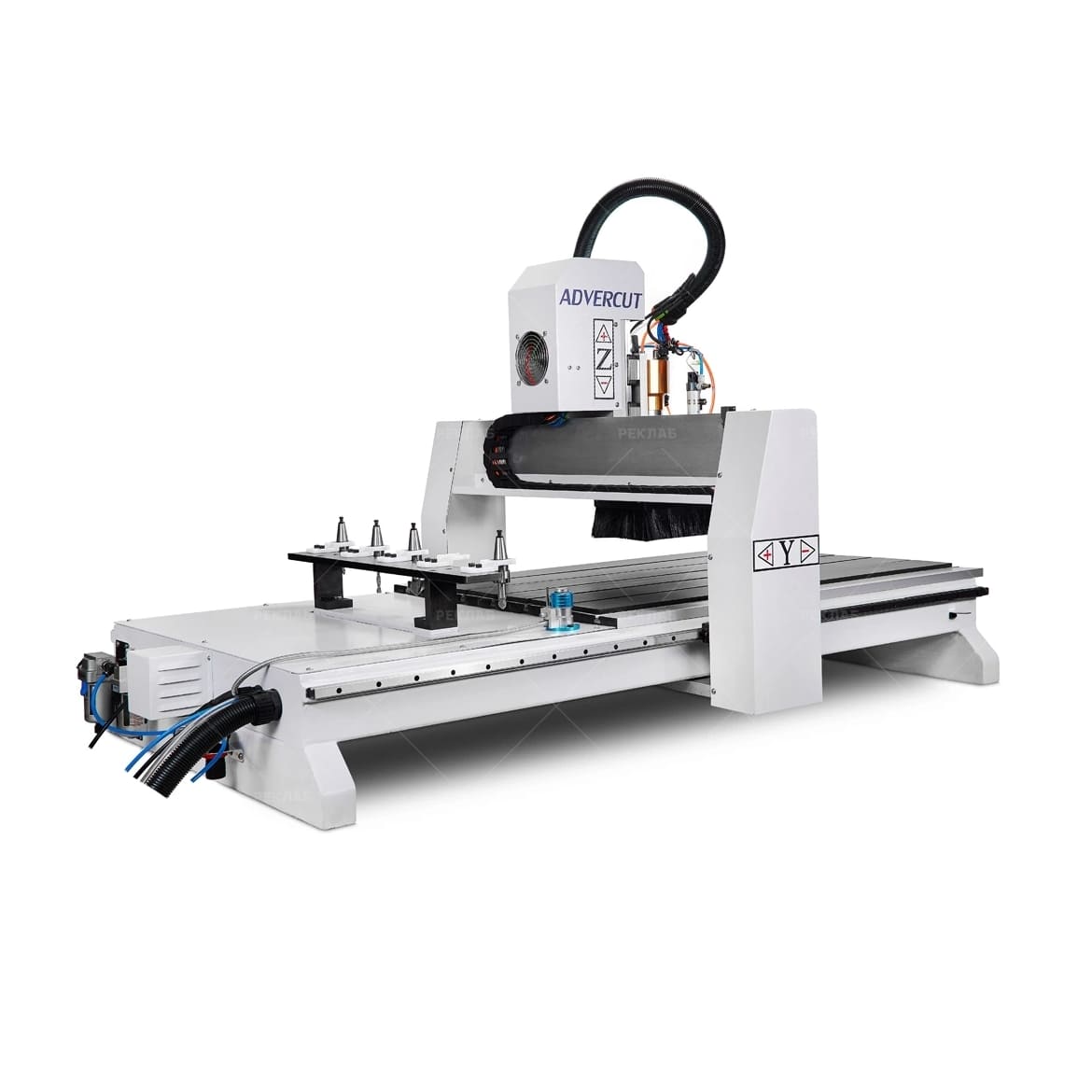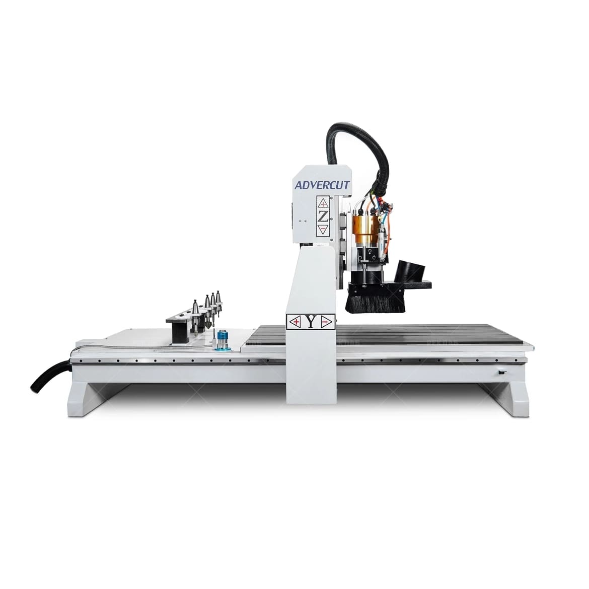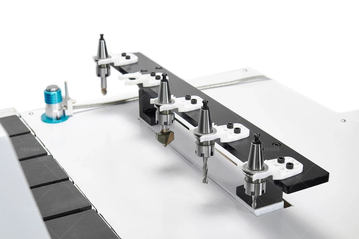 Станок оснащён линейной системой автоматической смены инструмента на 5 позиций. Этот тип ATC обеспечивает быструю замену фрез без участия оператора, что значительно сокращает время простоя и повышает общую производительность. Решение особенно эффективно при обработке изделий, требующих использования нескольких инструментов — например, для черновой выборки, чистовой обработки, гравировки и раскроя в одном цикле.