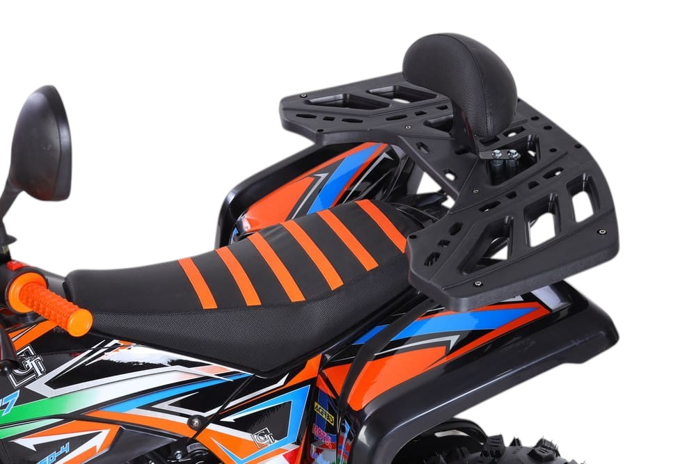 Квадроцикл оснащён вариативной трансмиссией (F-N-R), обеспечивающей плавное переключение между режимами движения вперёд, нейтралью и задним ходом. Привод — задний, что гарантирует хорошую управляемость и эффективную передачу тяги. Максимальная нагрузка составляет 200 кг, а запас хода достигает 100 км на одном баке топлива, что делает модель практичной для длительных поездок по загородным трассам или на дачном участке.