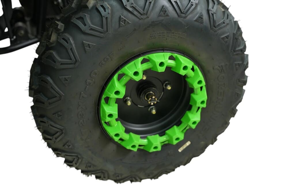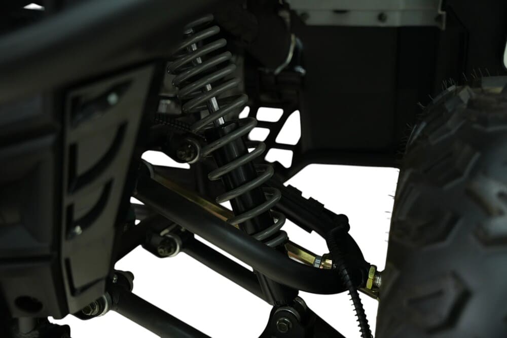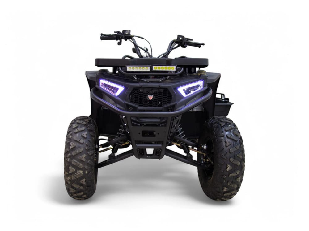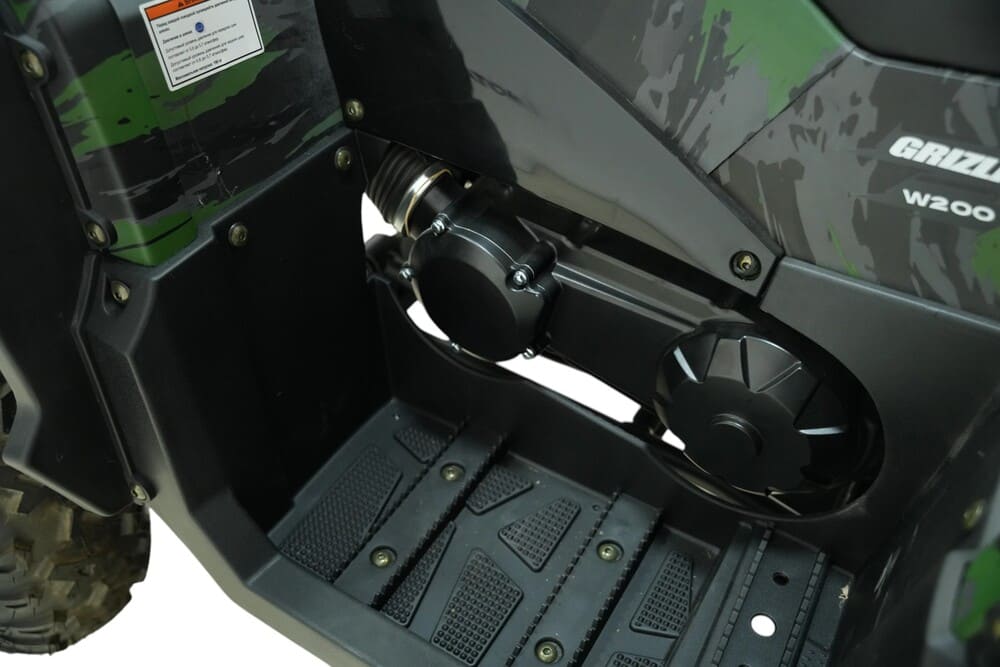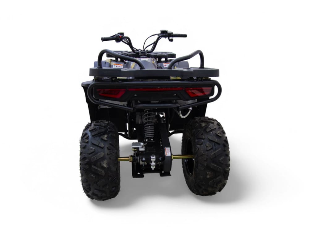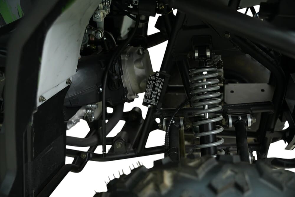 Подвеска квадроцикла разработана для максимального комфорта и проходимости. Передняя независимая двойная подвеска с амортизаторами эффективно поглощает удары, а задний одиночный амортизатор справляется с неровностями на пути. Дорожный просвет 15,5 см и колесная база 123 см обеспечивают устойчивость и контроль на любой местности. Шины размером 22×7-10 спереди и 22×10-10 сзади с агрессивным протектором гарантируют отличное сцепление с поверхностью.