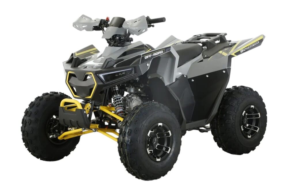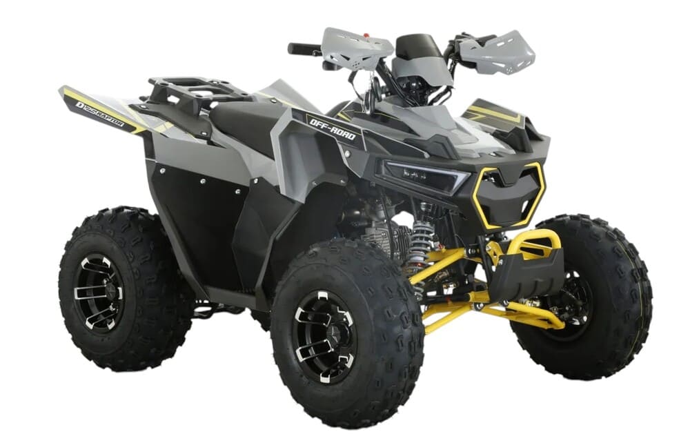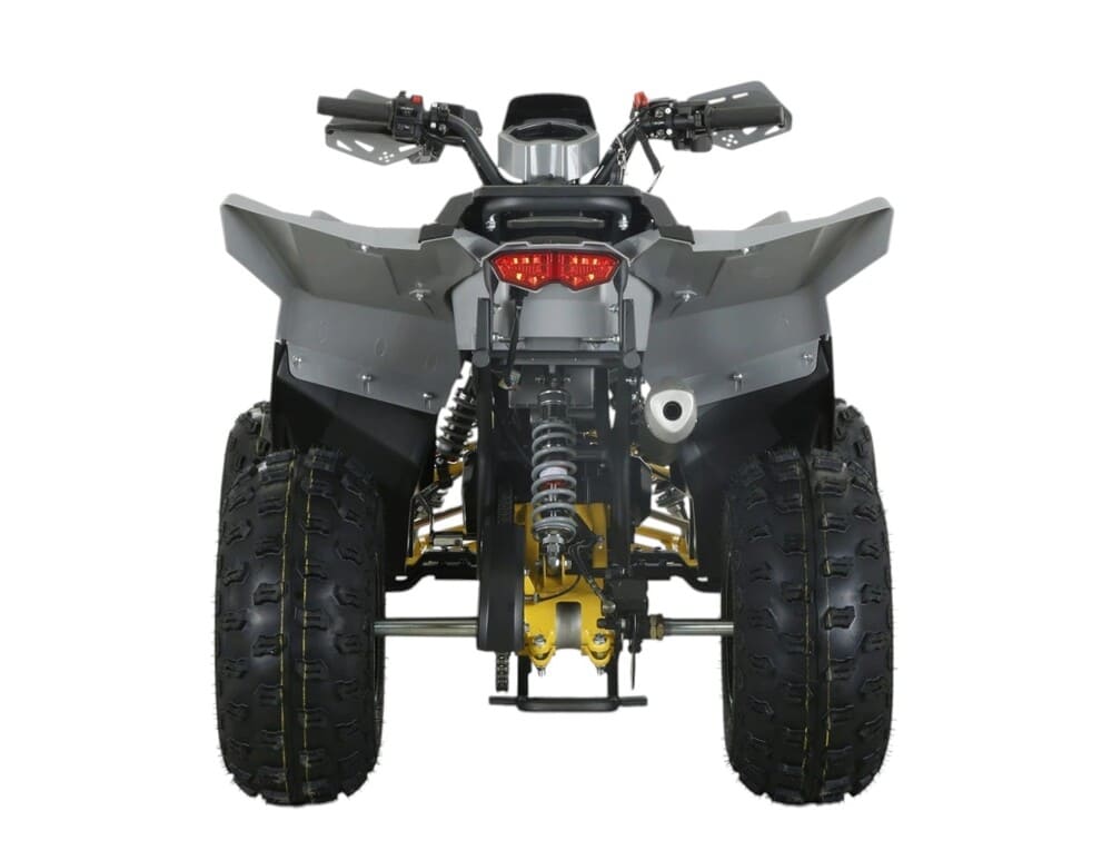 Квадроцикл работает на бензине АИ-92 и оснащён увеличенным топливным баком объёмом 5,4 литра, что значительно повышает автономность поездок. Трансмиссия — автоматическая, а привод — задний, что упрощает управление и идеально подходит как для новичков, так и для опытных пользователей. Общий вес модели составляет всего 104 кг, что делает его более маневренным и легким в управлении по сравнению с аналогами.