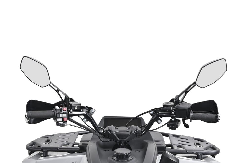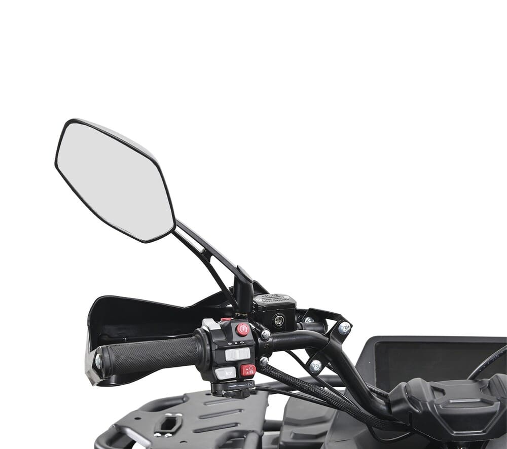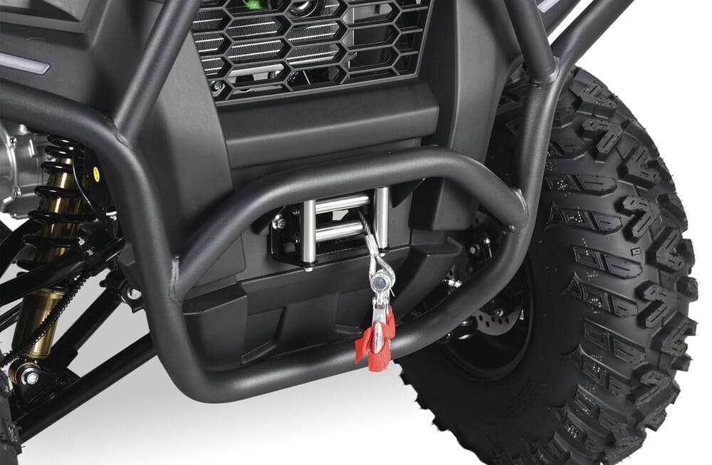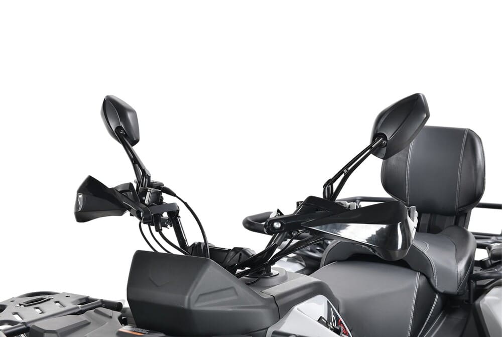 Для комфорта и устойчивости установлены 2-рычажная шаровая передняя подвеска и гидравлический задний амортизатор с регулировкой жесткости. Колёса диаметром 10 дюймов с внедорожными шинами 23×7-10 (передние) и 22×10-10 (задние) обеспечивают отличное сцепление на песке, грязи и снегу. Также в конструкции предусмотрен вместительный топливный бак объёмом 9 литров, позволяющий проехать до 140 км без дозаправки.