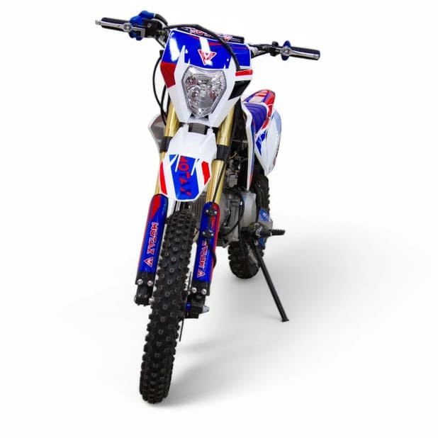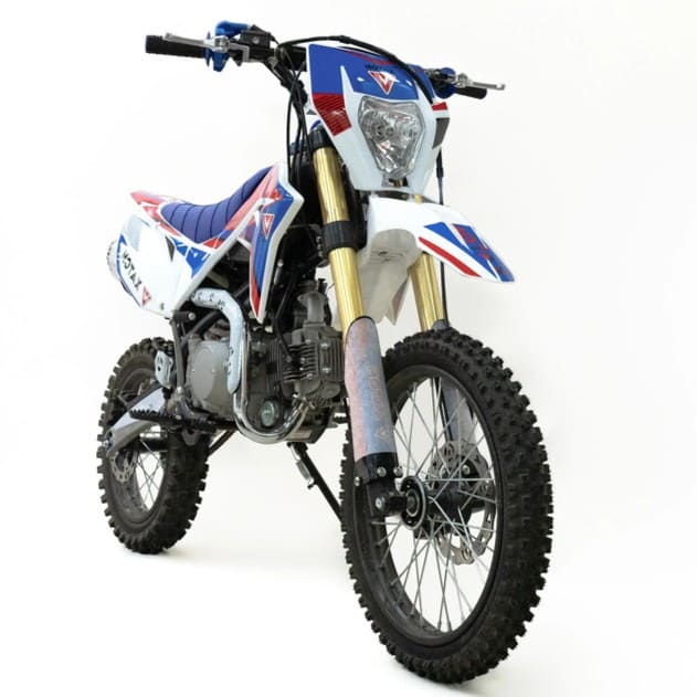 Питбайк оборудован пневмо-гидравлической вилкой спереди, обеспечивающей мягкую и предсказуемую работу подвески. Клиренс в 31 см позволяет свободно передвигаться по пересеченной местности. Для уверенности на трассе установлены дисковые тормоза: передние механические и задние гидравлические, гарантирующие надежное замедление в любых погодных условиях.