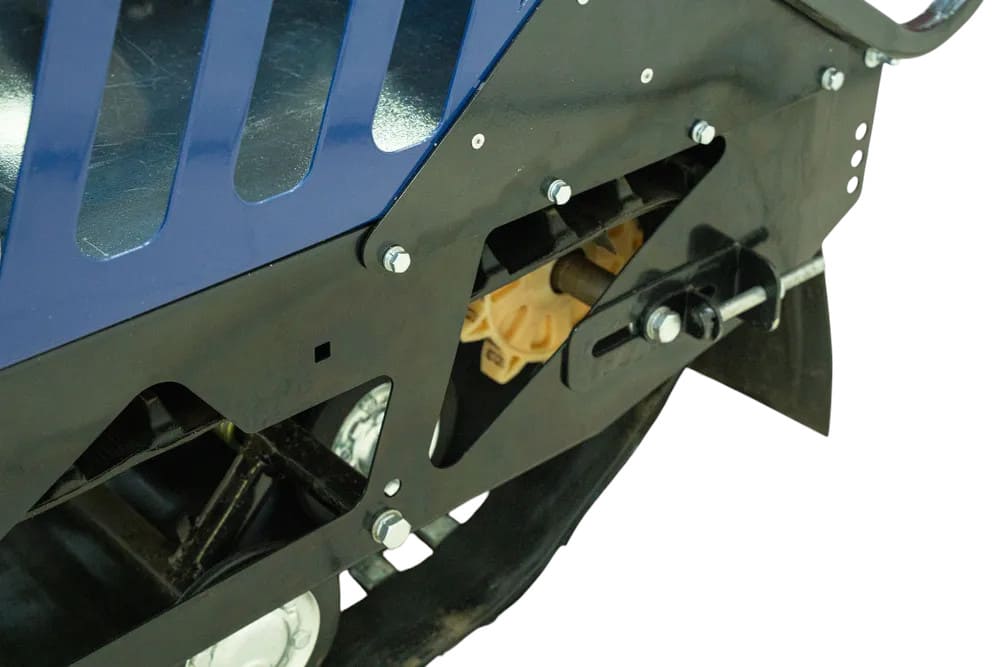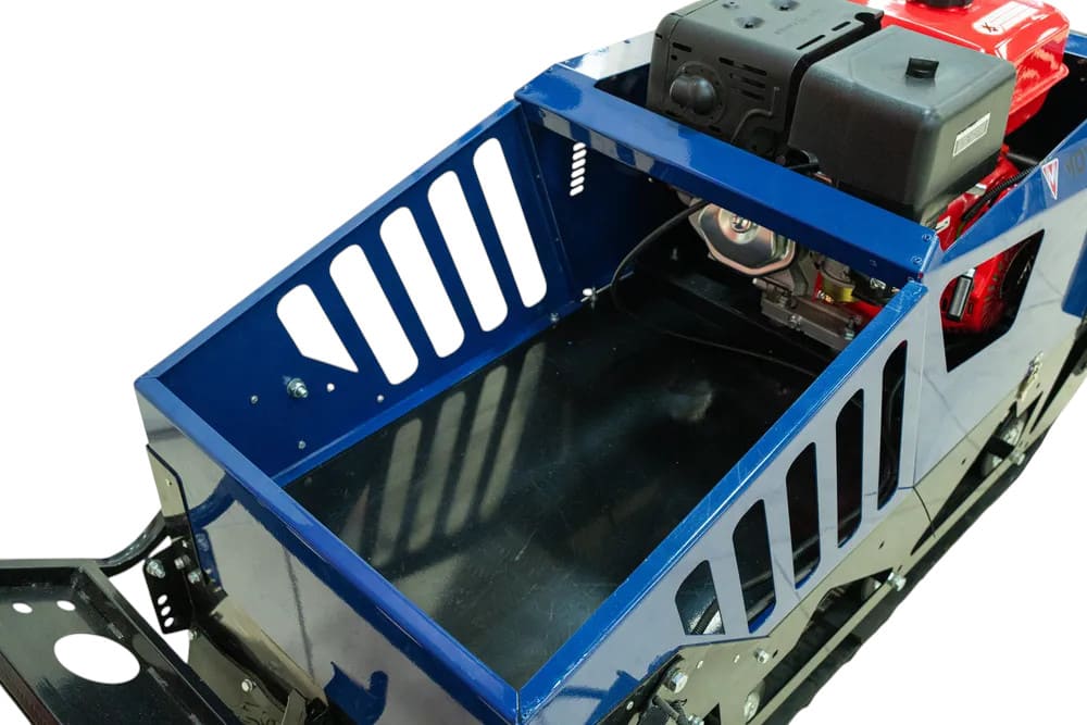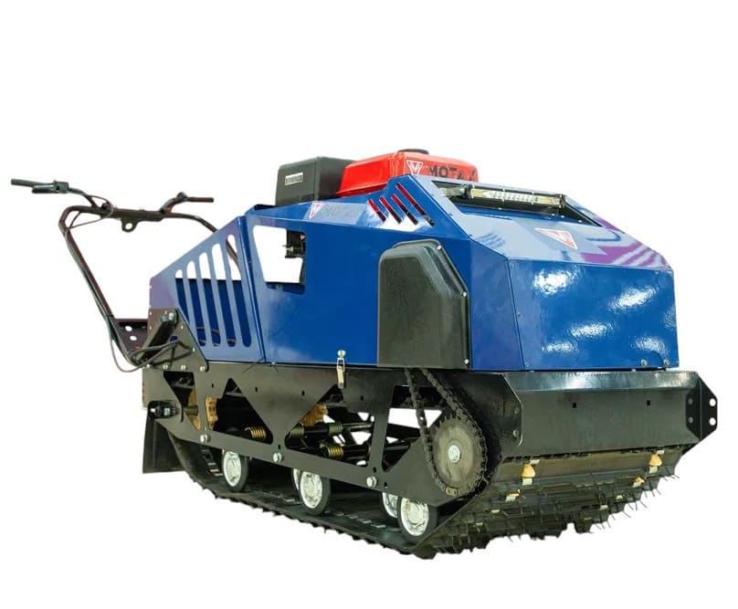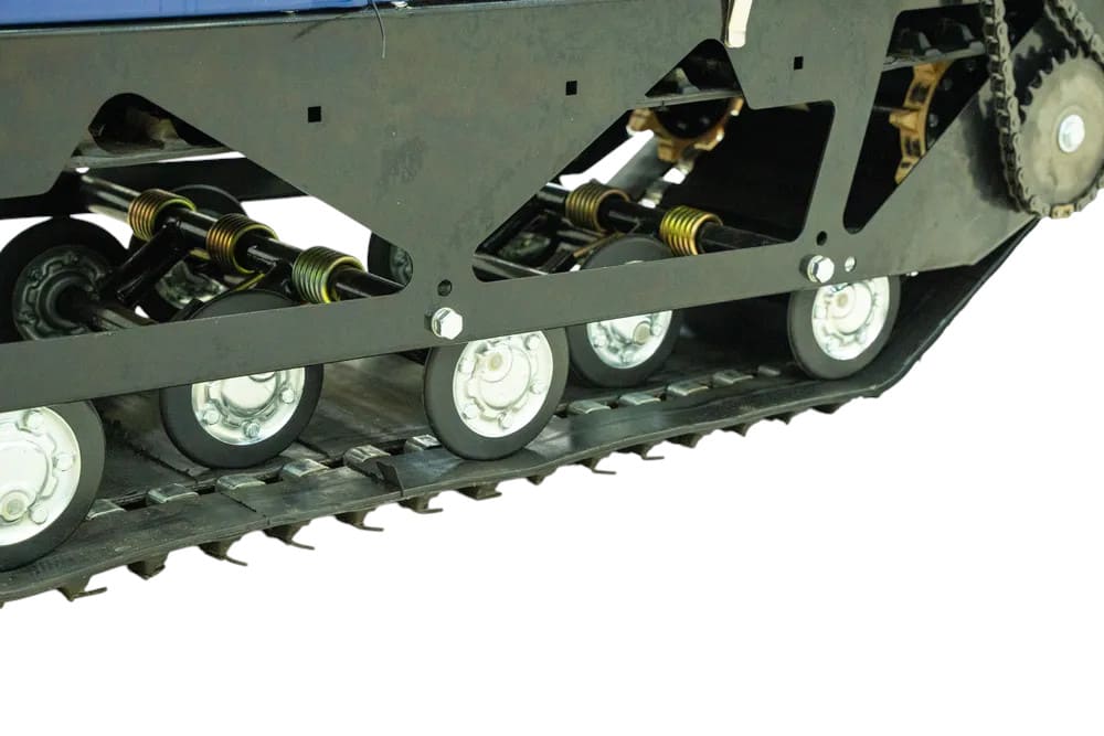 Мотобуксировщик оснащён широкой резинотканевой армированной гусеницей 500×2828 мм, обеспечивающей отличное сцепление со снегом и высокую проходимость. Передняя подвеска — катковая, которая смягчает удары при движении по неровностям. Встроенная фара и световые сигналы обеспечивают безопасность при поездках в темное время суток.