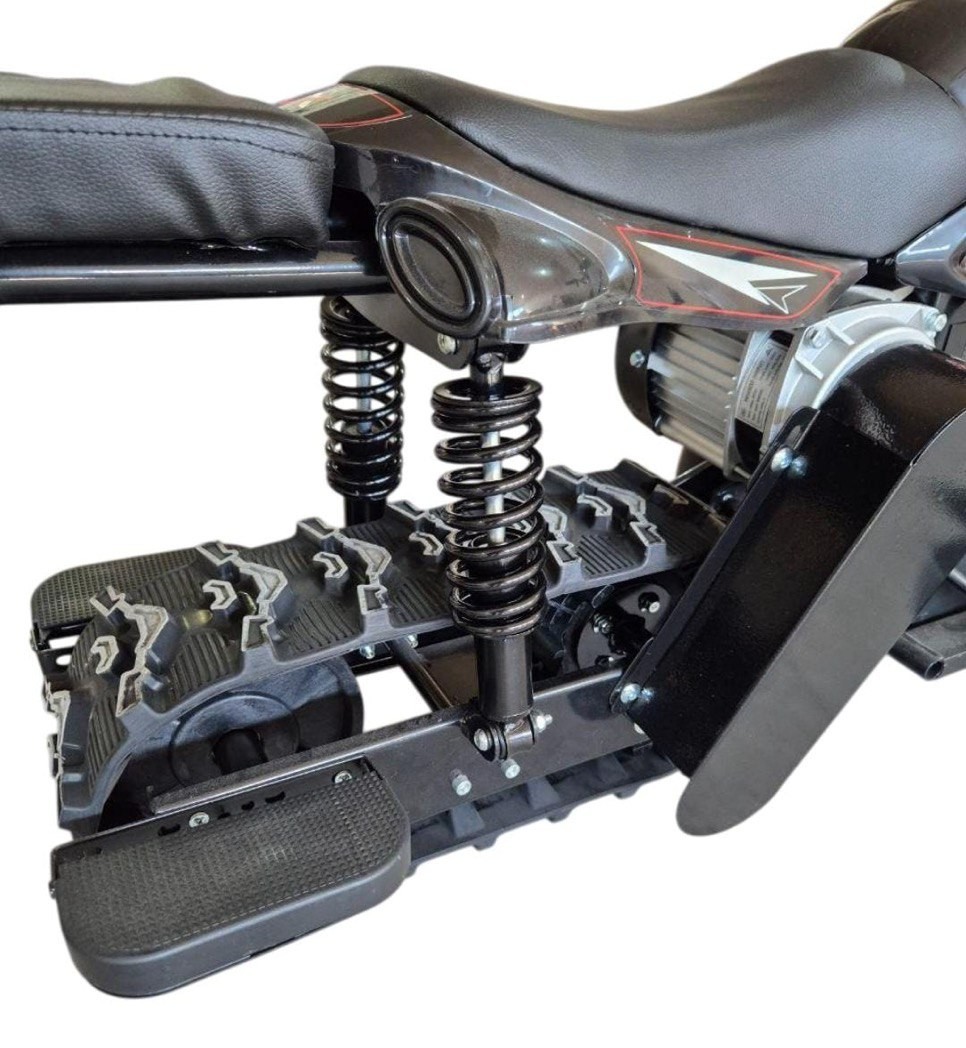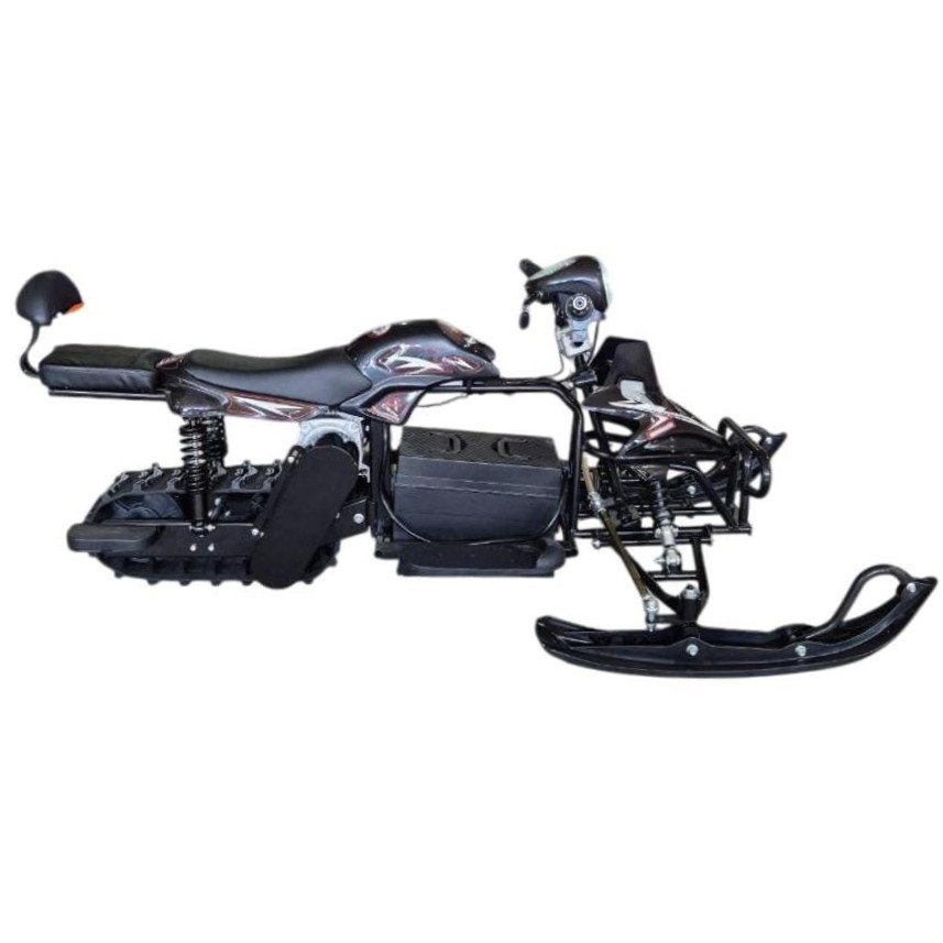 Конструкция выполнена с учётом повышенной прочности и устойчивости. Электроснегоход оснащён надёжной подвеской и прочной гусеницей, обеспечивающими плавный ход и контроль на любом рельефе. Управление интуитивно понятное, а эргономичный дизайн руля и посадки делает длительные поездки комфортными даже в сильный мороз.
