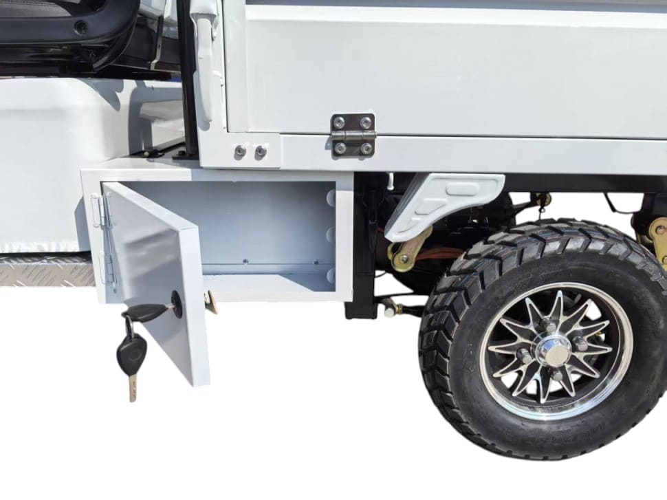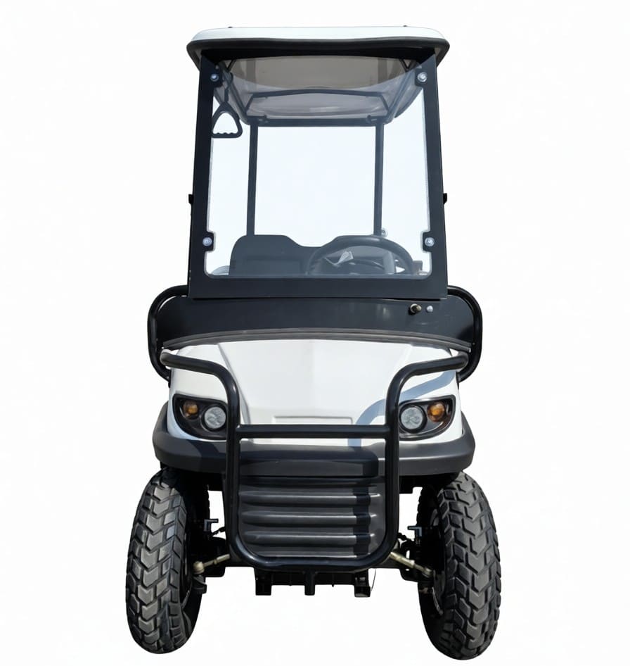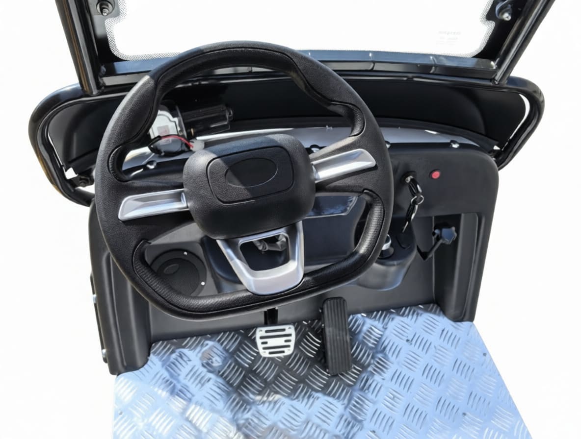 Гольфкар может быть укомплектован аккумуляторами двух типов: литиевым NMC Boston Swing или гелевым SLA Chilwee, что позволяет выбрать оптимальное решение по соотношению цена/ресурс. Запас хода составляет до 60 км, а полная зарядка занимает около 8 часов. Цифровой дисплей выводит всю ключевую информацию: скорость, режим работы и уровень заряда. Дорожный просвет — 13 см, что обеспечивает хорошую проходимость даже на неровных поверхностях.