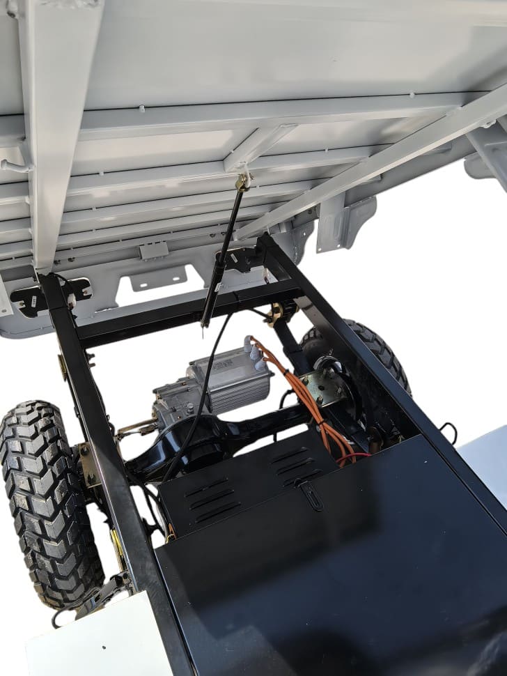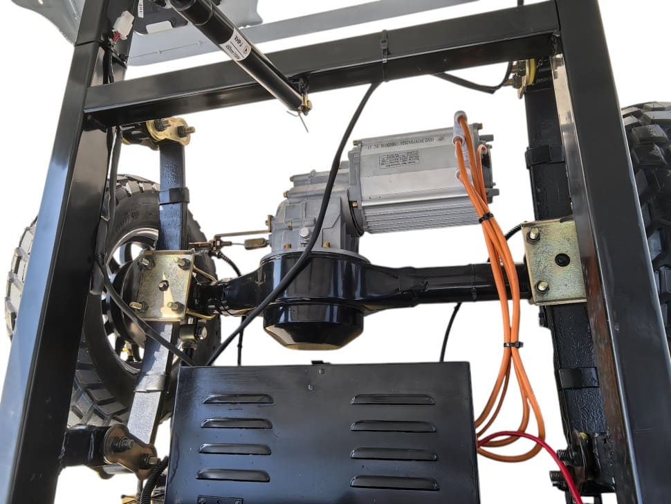 Конструкция включает дифференциал в трансмиссии, обеспечивающий плавные повороты и эффективное распределение тяги. Передняя подвеска оснащена усиленными масляными амортизаторами ходом 310 мм, а задняя — пружинами 13×300 мм, что гарантирует комфорт при движении по грунтовкам и выбоинам. Тормозная система — гидравлические дисковые тормоза — обеспечивает мощное и стабильное торможение даже под нагрузкой.