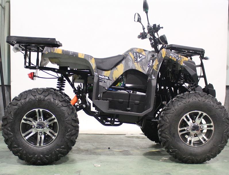 Техническое оснащение включает мощный электродвигатель 3000W 72V с крутящим моментом 252.3N.M и батарею из шести элементов по 12V52AH. Полуавтоматическая трансмиссия 1+1 обеспечивает комфортное управление. Квадроцикл комплектуется шоссейной резиной размерностью 23×7-10 спереди и 22×10-10 сзади, установленной на легких алюминиевых дисках.