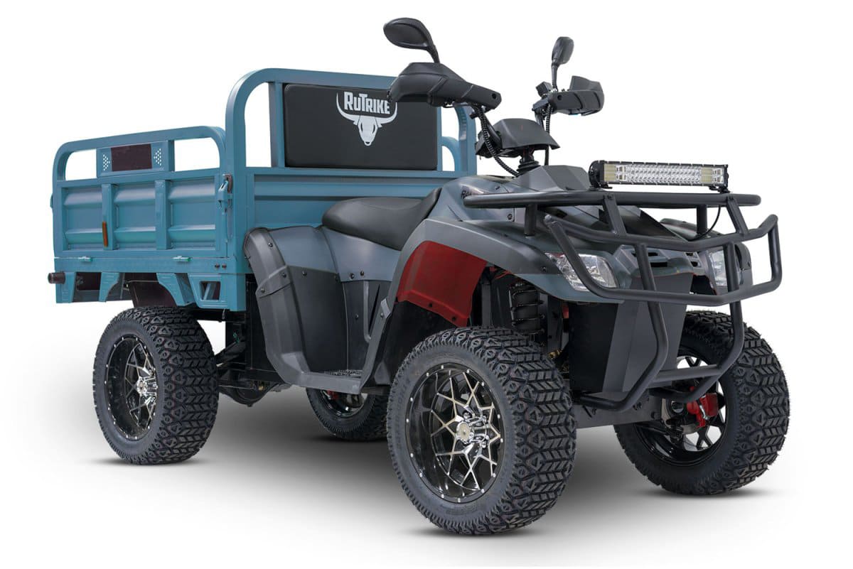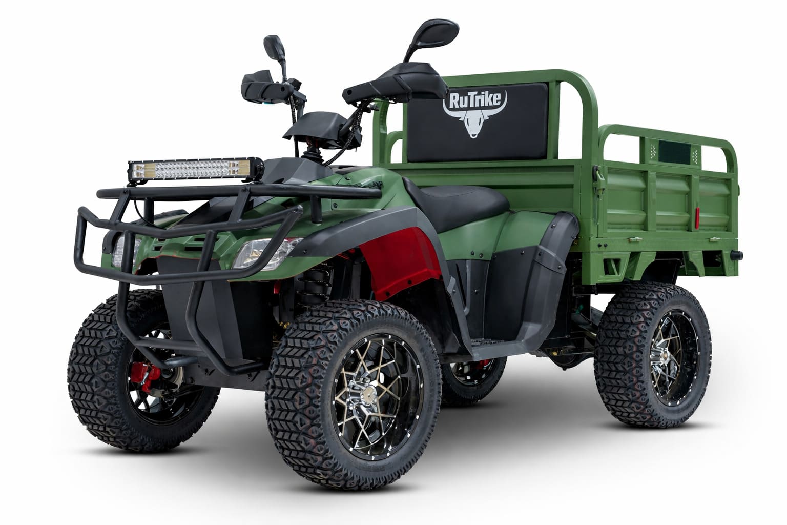 Rutrike Рейнджер — это профессиональный грузовой электроквадроцикл, созданный для интенсивной работы в условиях строительства, сельского хозяйства и промышленных объектов. Оснащённый синхронным электродвигателем мощностью 3000 Вт, он обеспечивает стабильную тягу при максимальной нагрузке до 700 кг и преодолевает уклоны до 15°. Аккумуляторная система 60 В поддерживает выбор между AGM, GEL или LiFePO4-батареями, обеспечивая запас хода до 100 км. Полная зарядка занимает 10 часов, а задний привод гарантирует простоту обслуживания и надёжность на грунтовых дорогах.
