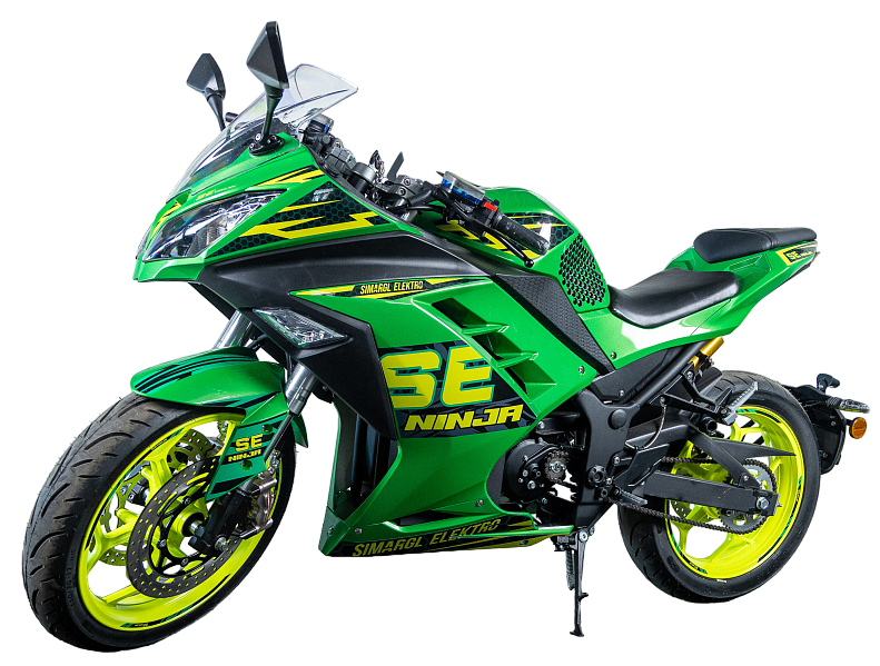 - В отличиe от моделей на моторколёсах, на SE-Ninja установлен центральный двигатель, что полностью исключает неподрессоренную массу, делает электромотоцикл более комфортным на высоких скоростях, устойчивым в поворотах и при прохождении неровностей на дороге.