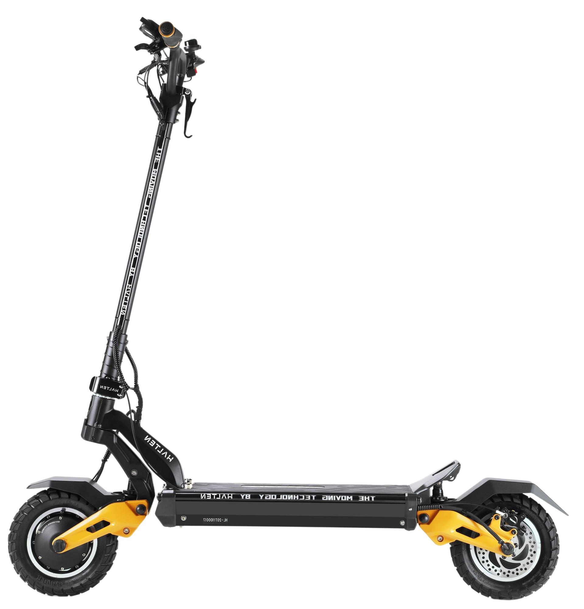 Электросамокат Halten Strong предлагает полный привод и передвигается на 10-дюймовых колесах с пневматическими шинами, что делает его отличным выбором для передвижения по грунтовым дорожкам или тропинкам в сельской местности.