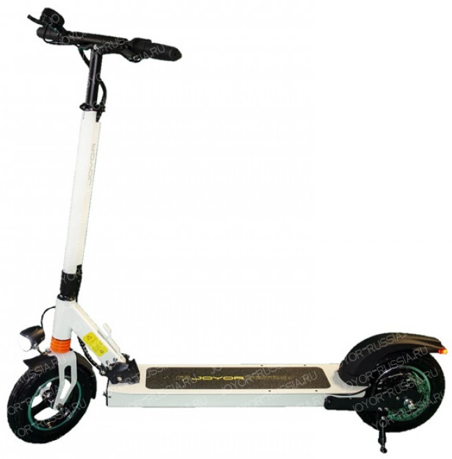 Электросамокат Joyor Y1 с большими 10-дюймовыми пневматическими (надувными) колесами, имеющими отличные амортизирующие и противоскользящие протекторы, в сочетании с бесщеточным электродвигателем постоянного тока мощностью 400 Вт, обеспечивает более плавную езду.