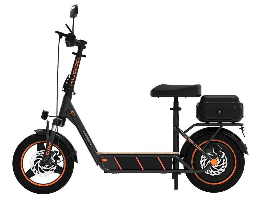 Электросамокат Kugoo C1 Pro Plus имеет складной механизм, что облегчает его хранение и транспортировку. Также он оснащён багажником и корзиной, которые позволяют взять с собой необходимые вещи. Вес самоката — 25 кг.