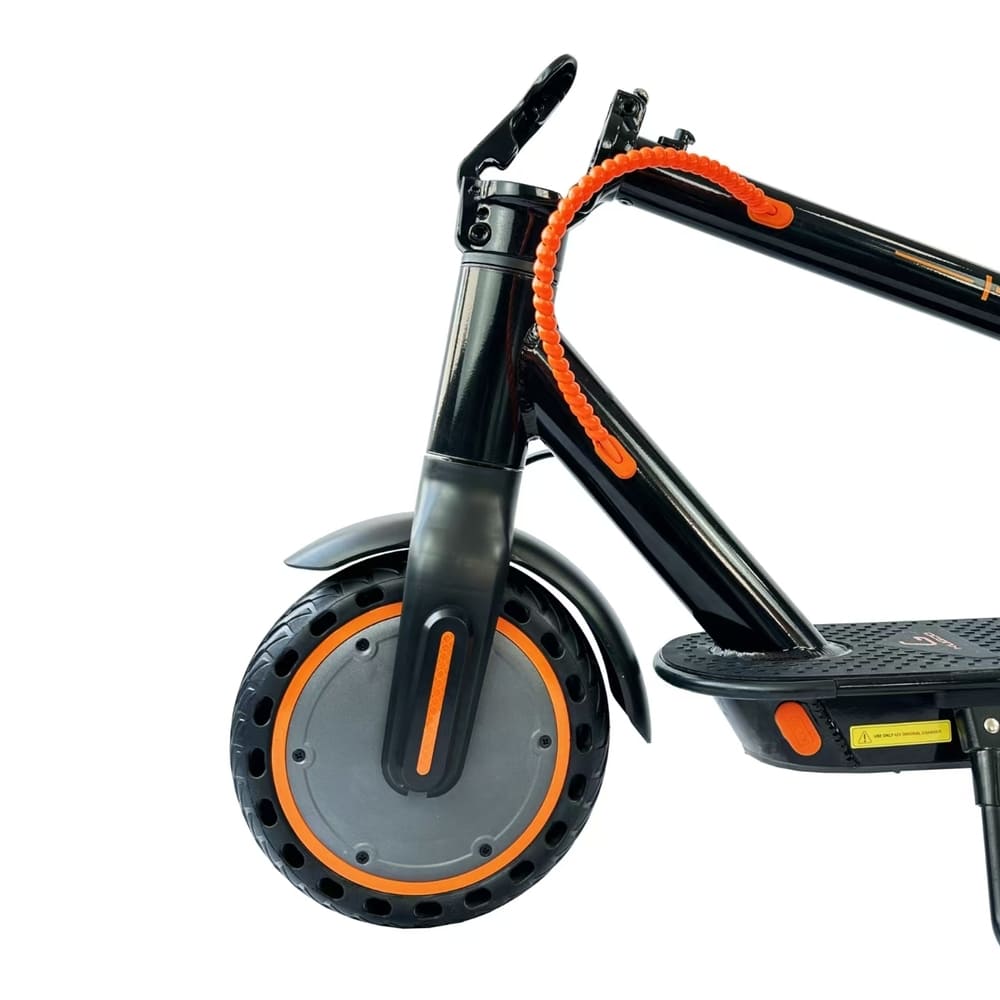 Электросамокат обладает компактными размерами и легким весом в 14 кг, что делает его удобным для транспортировки и маневрирования. Мощность двигателя составляет 350 Вт, а максимальная скорость — 30 км/ч, чего достаточно для комфортных поездок по городу или парку. Благодаря переднему приводу управление остается стабильным и предсказуемым.