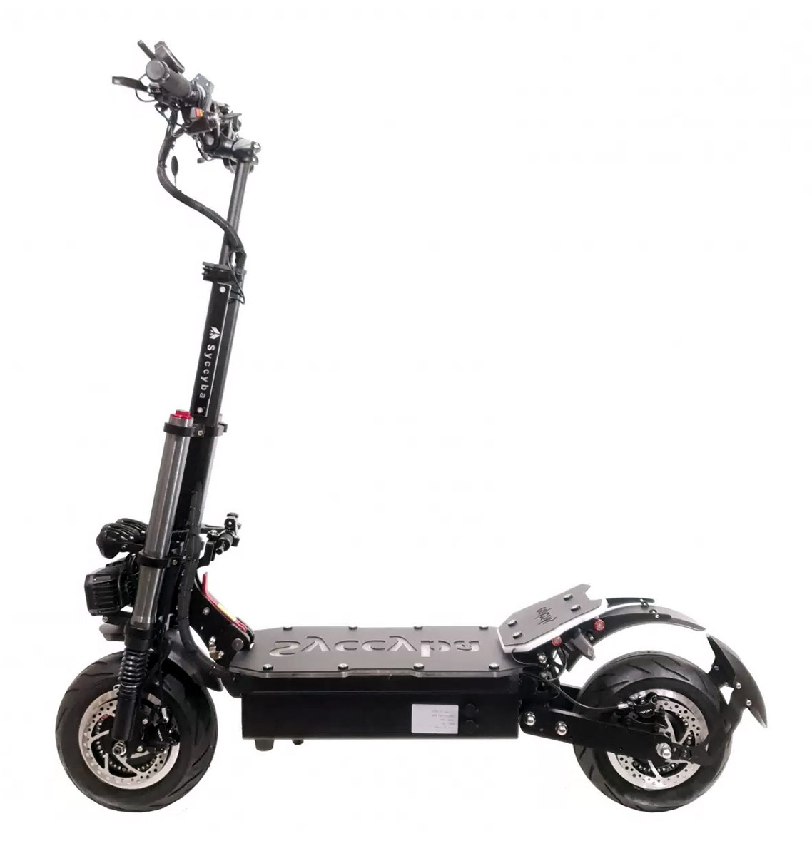 Syccyba R12 Pro оснащен мощными аккумуляторами, обеспечивающими запас хода до 120 км. Также электросамокат оборудован электродвигателем мощностью 6000 Вт, который позволяет развивать максимальную скорость до 90 км/ч.