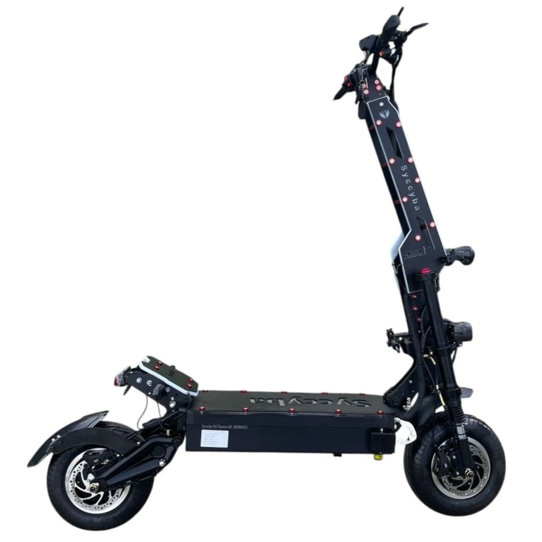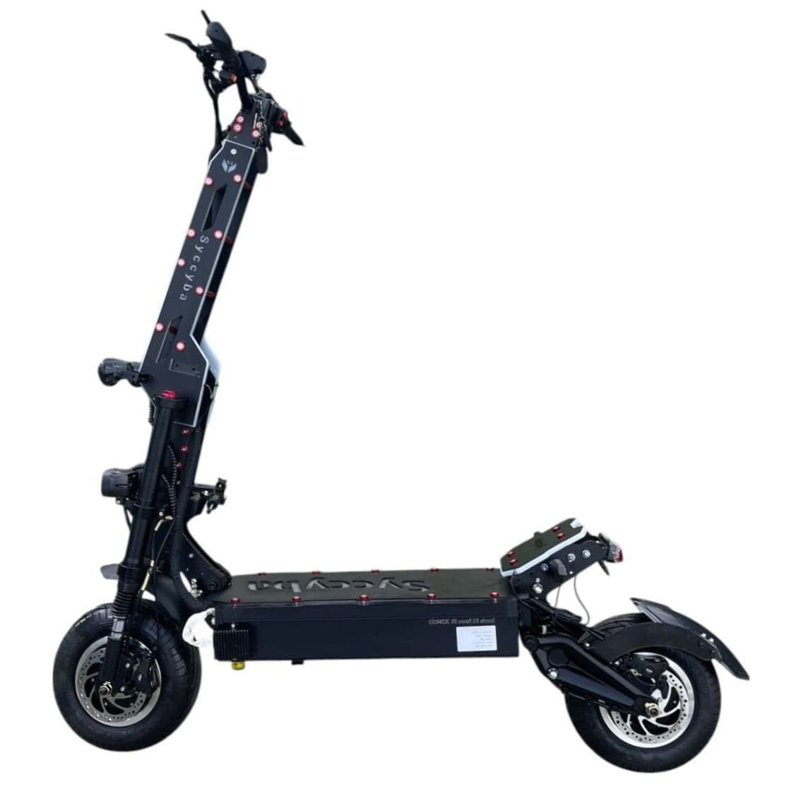 Syccyba Goleaf — это флагманская модель среди высокопроизводительных электросамокатов, созданная для тех, кто ценит мощность, скорость и дальний пробег. Мощность двигателя составляет 10 000 Вт, а максимальная скорость может достигать 110 км/ч — это делает его настоящим соперником мотороллерам и легким мотоциклам. Устройство рассчитано на нагрузку до 200 кг, что позволяет использовать его даже в паре или с дополнительным грузом.