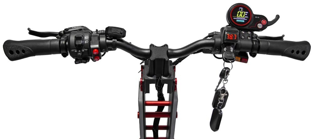 Для комфортной езды предусмотрены сразу два амортизатора: передний и задний, которые обеспечивают плавность хода даже на неровных поверхностях. Сбалансированная подвеска делает самокат устойчивым и управляемым как на высокой скорости, так и при резких маневрах. Это полноценный транспорт для города и загородных трасс с повышенными требованиями к проходимости.
