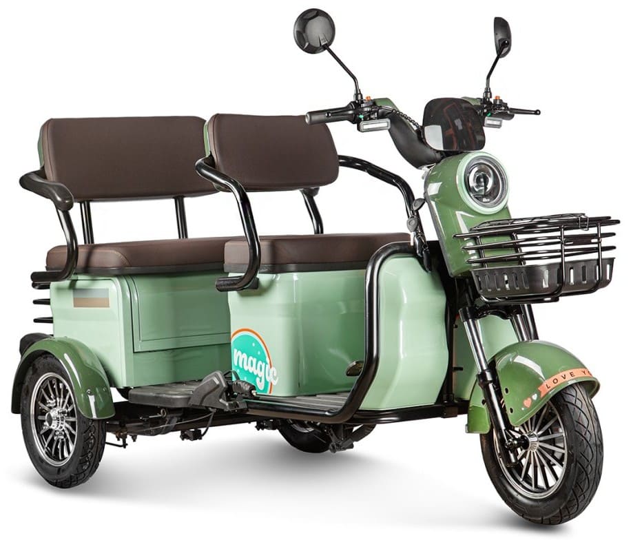 Электротрицикл работает от аккумулятора с напряжением 48/60 В и емкостью от 20 до 32 А·ч (аккумулятор не входит в комплектацию), что позволяет подобрать батарею под индивидуальные потребности по автономности и мощности. Для безопасного торможения предусмотрены барабанные тормоза спереди и сзади, отличающиеся надежностью и долговечностью даже при регулярном использовании.