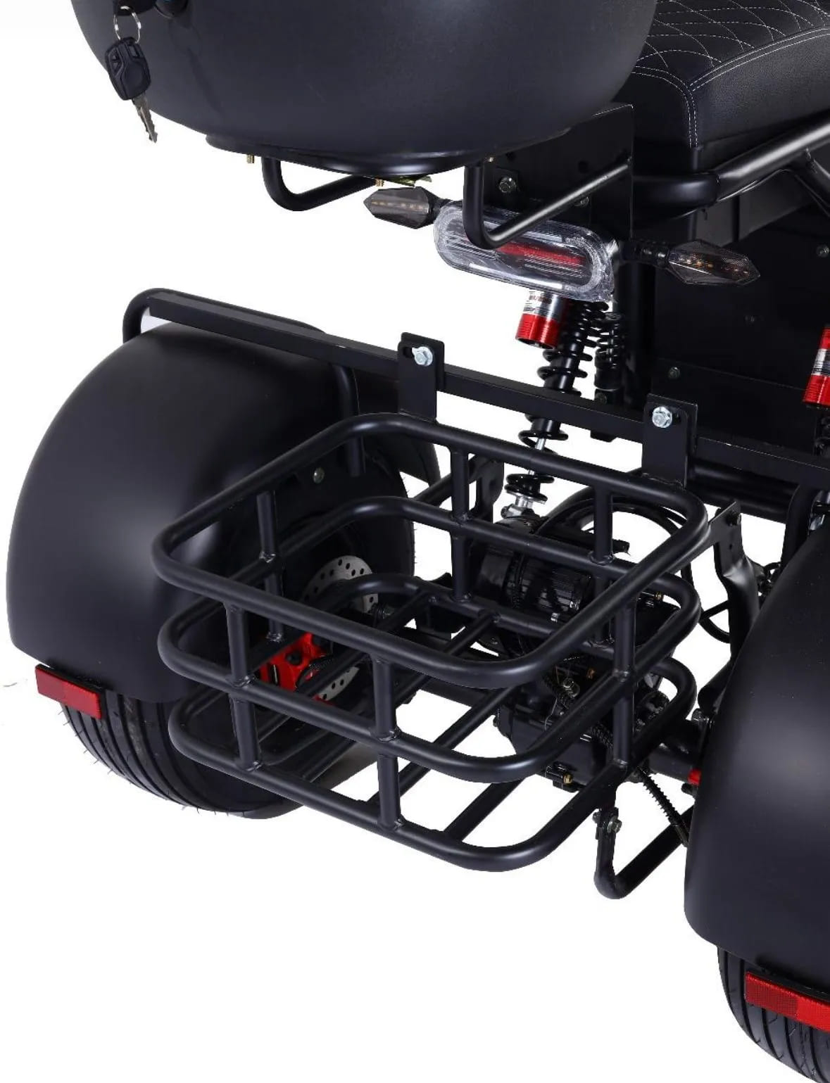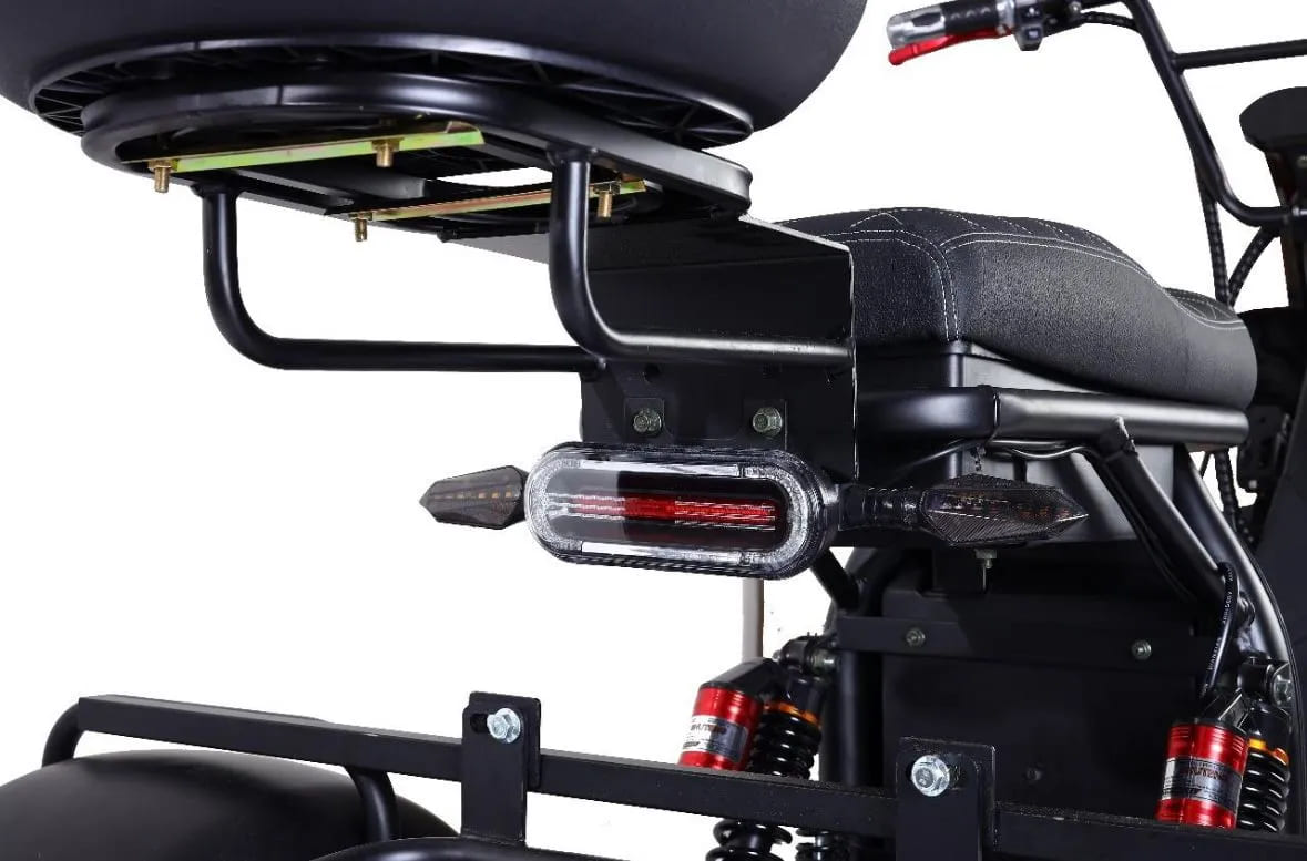 Трёхколёсная конструкция обеспечивает исключительную устойчивость, особенно при остановках, поворотах и движении по неровным поверхностям. Это делает скутер идеальным выбором как для пожилых пользователей, так и для коммерческих задач — доставки, логистики или эксплуатации на закрытых территориях. Прочная стальная рама выдерживает нагрузку до 200 кг, а общий вес модели составляет 96 кг, что говорит о его усиленной, надёжной сборке.