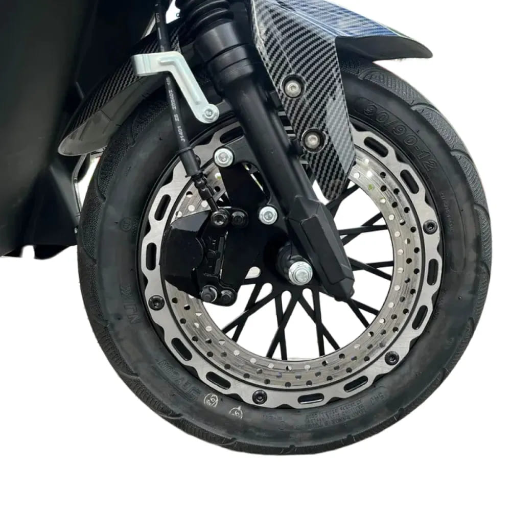Для безопасности и контроля при высокой скорости установлены гидравлические дисковые тормоза спереди и сзади — одна из самых эффективных систем торможения, обеспечивающая стабильное и мощное замедление в любых условиях. Подвеска включает передние гидравлические амортизаторы и настраиваемые задние демпферные амортизаторы, что позволяет адаптировать жёсткость под стиль езды и тип дороги, повышая комфорт и устойчивость.