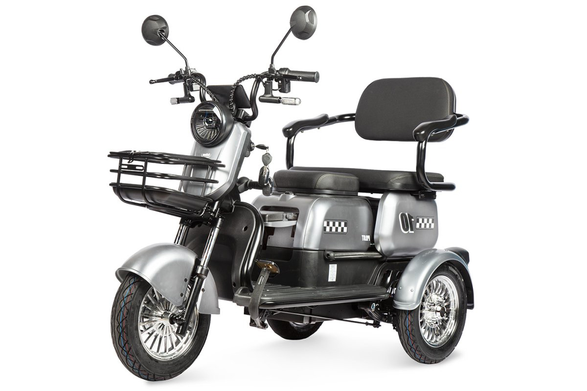 Трицикл также оснащен вместительной металлической корзиной, светодиодной фарой, поворотниками и качественной тормозной системой, что позволяет путешествовать в вечернее время с комфортом и безопасностью.
