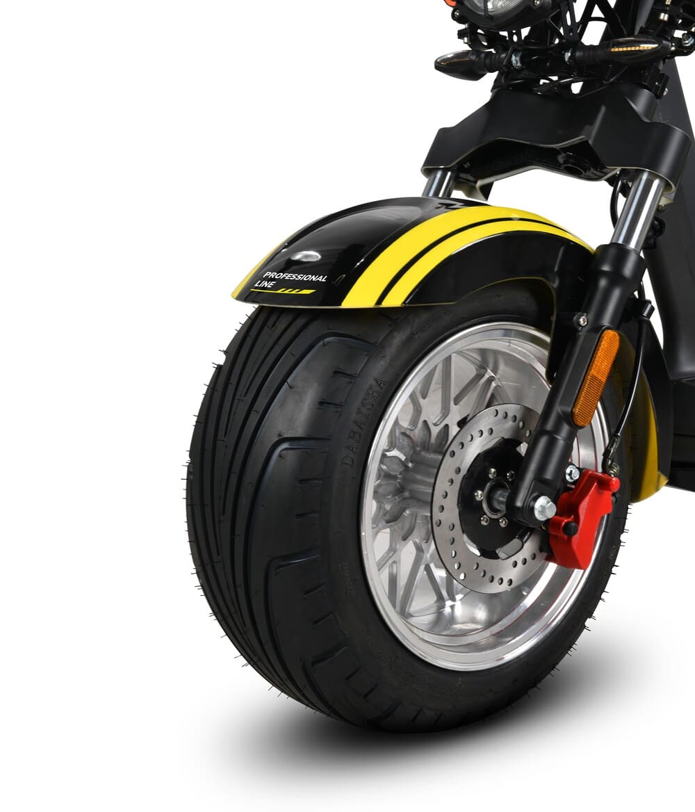 Для безопасности установлены гидравлические дисковые тормоза на всех трёх колёсах, обеспечивающие мощное и предсказуемое торможение. Также в комплекте — передняя фара, стоп-сигнал, поворотники и сигнализация, что делает эксплуатацию безопасной в любое время суток и снижает риск угона. Колёса диаметром 12 дюймов с шинами 215/40-12 обеспечивают отличное сцепление и проходимость.