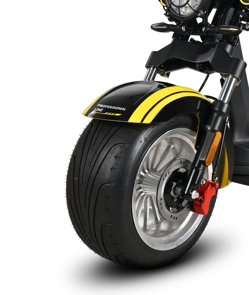 Конструкция выполнена на прочной стальной раме, выдерживающей интенсивные нагрузки и обеспечивающей долговечность. Скутер оснащён двумя колёсами диаметром 12 дюймов с шинами 215/40-12, которые обеспечивают отличное сцепление с дорогой и устойчивость на высокой скорости. Благодаря двухколёсной конфигурации, модель остаётся маневренной и простой в управлении, как классический электросамокат большого формата.