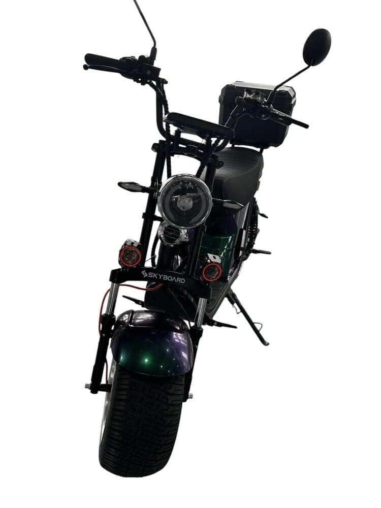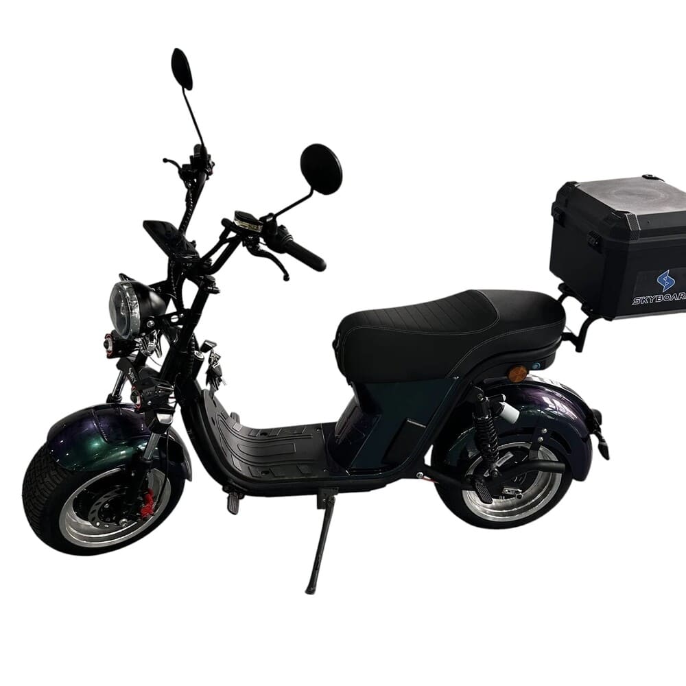 Для удобства и безопасности предусмотрены: держатель телефона с USB-выходом, встроенные динамики с поддержкой Bluetooth, задний багажный бокс (кофр), подставка под ноги и подножка с блокировкой питания. Система безопасности включает сигнализацию, замок зажигания, блокировку руля и закрытый доступ к проводке и аккумулятору. Внутренняя проводка выполнена по европейским стандартам, а корпус защищен гибким противоударным пластиком. Это технологичный, безопасный и комфортный электротранспорт для города и не только.