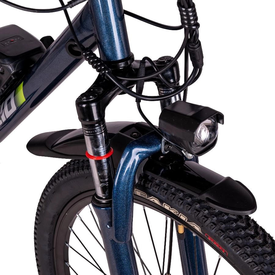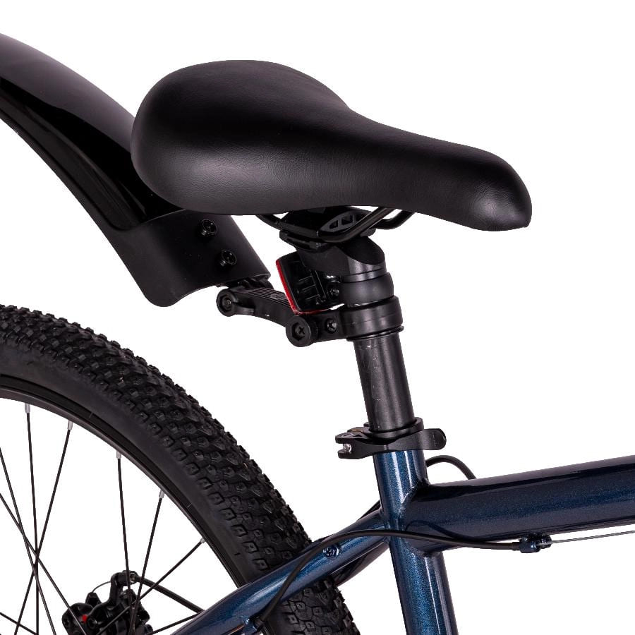 Для комфорта установлена пружинная амортизационная вилка, эффективно смягчающая удары от неровностей дороги. Колёса диаметром 27,5 дюйма обеспечивают плавный ход, хорошее сцепление и высокую проходимость по сравнению с компактными моделями. Тормозная система — механические дисковые тормоза спереди и сзади — гарантирует надёжное и стабильное торможение даже на мокрой дороге.