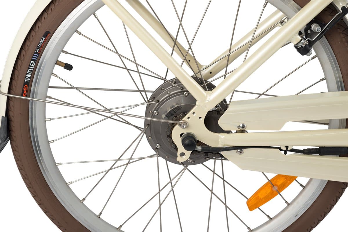 Конструкция ориентирована на городскую маневренность: колёса диаметром 24 дюйма обеспечивают компактность и чёткое управление в плотном потоке, а жёсткая подвеска минимизирует потери энергии, повышая эффективность педалирования. Общий вес модели — 25 кг, что делает её удобной для переноски при необходимости. Низкая посадка, обтекаемый руль в стиле кафе-рейсер и лаконичные линии рамы подчеркивают спортивный характер, сохраняя при этом практичность для повседневных поездок.
