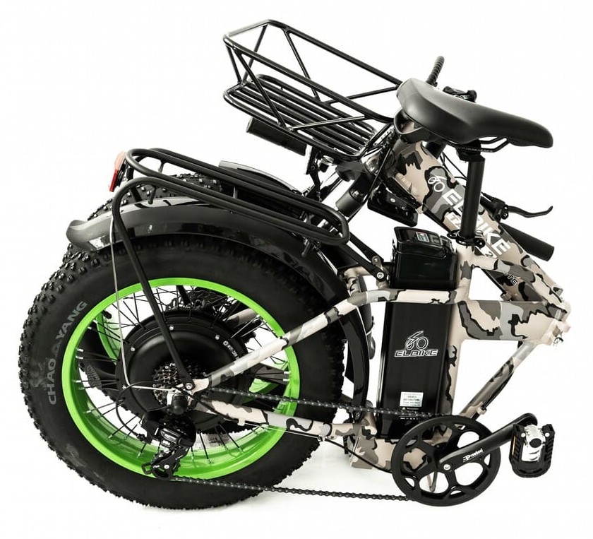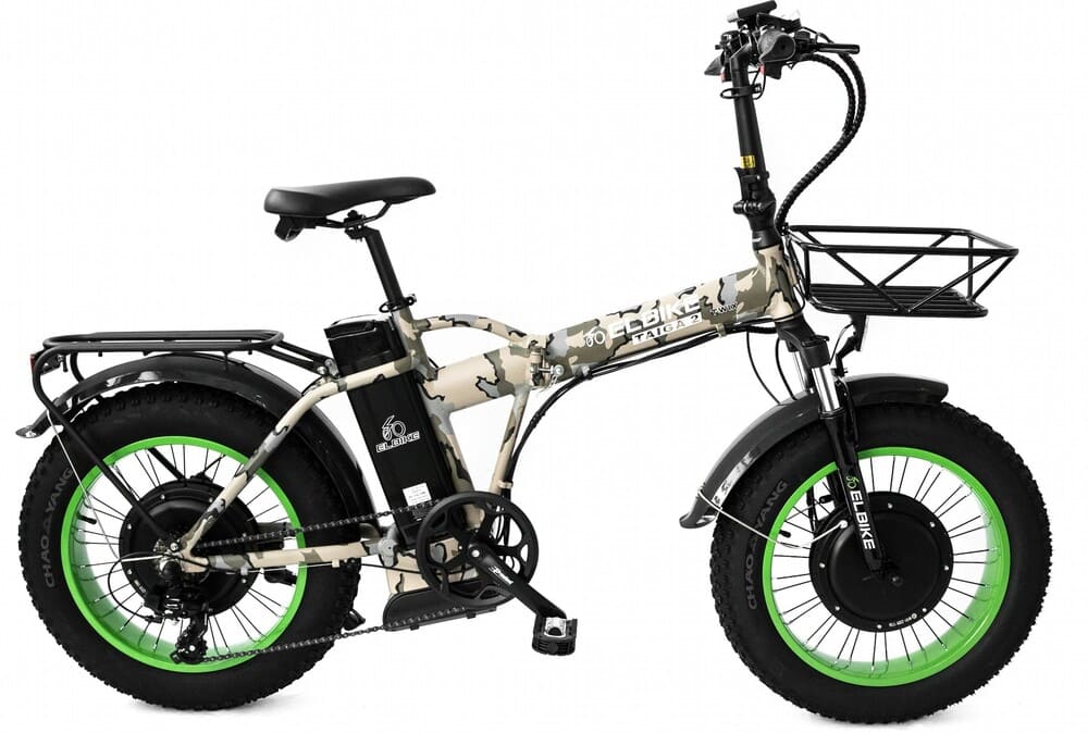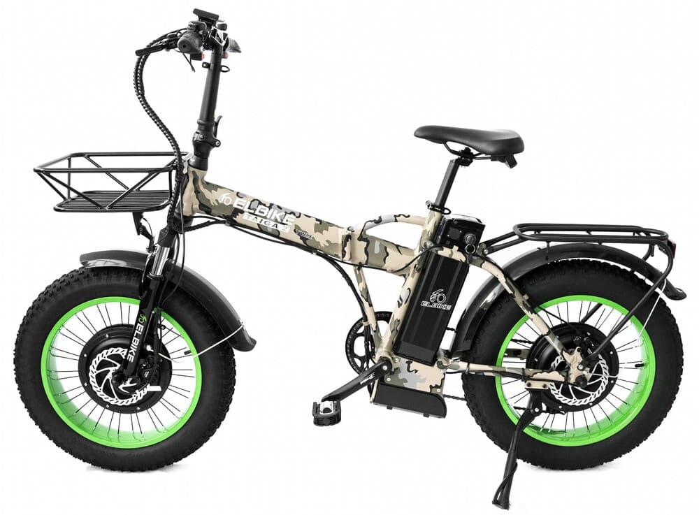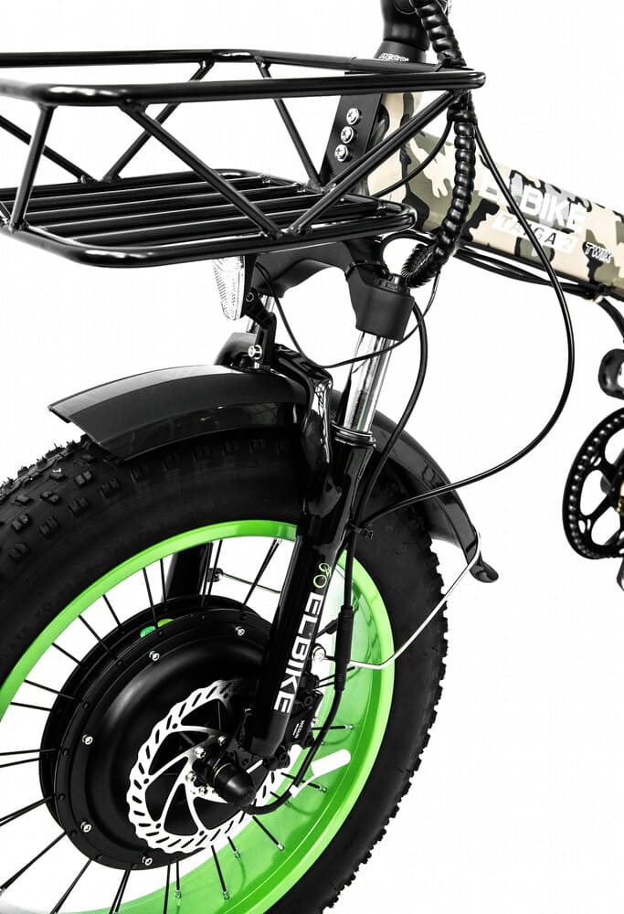 Elibike TAIGA 3 Twix cam оборудован багажником, что делает его удобным для перевозки мелких грузов или сумок. Стильный камуфляжный дизайн подчеркивает спортивный характер модели, а полный привод гарантирует уверенное поведение на любом покрытии — от асфальта до грунтовки. Это универсальное средство передвижения для тех, кто ищет комфорт, проходимость и современный внешний вид в одном устройстве.