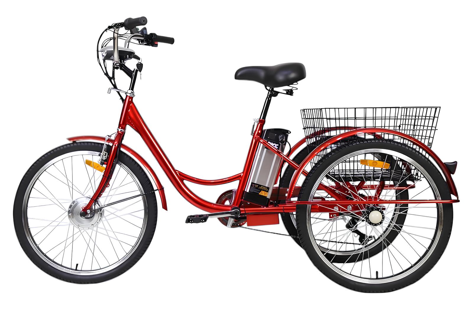 Трицикл выполнен на прочной алюминиевой раме весом всего 30 кг, выдерживает нагрузку до 140 кг и оснащён дисковыми тормозами для безопасного торможения. Колёса диаметром 24 дюйма обеспечивают устойчивость и плавность хода, а жёсткая подвеска подчёркивает ориентацию на ровные дороги. В комплекте — багажник, что делает модель идеальной для перевозки покупок или грузов. Это практичное и стильное решение для тех, кто ценит комфорт, надёжность и экологичность.