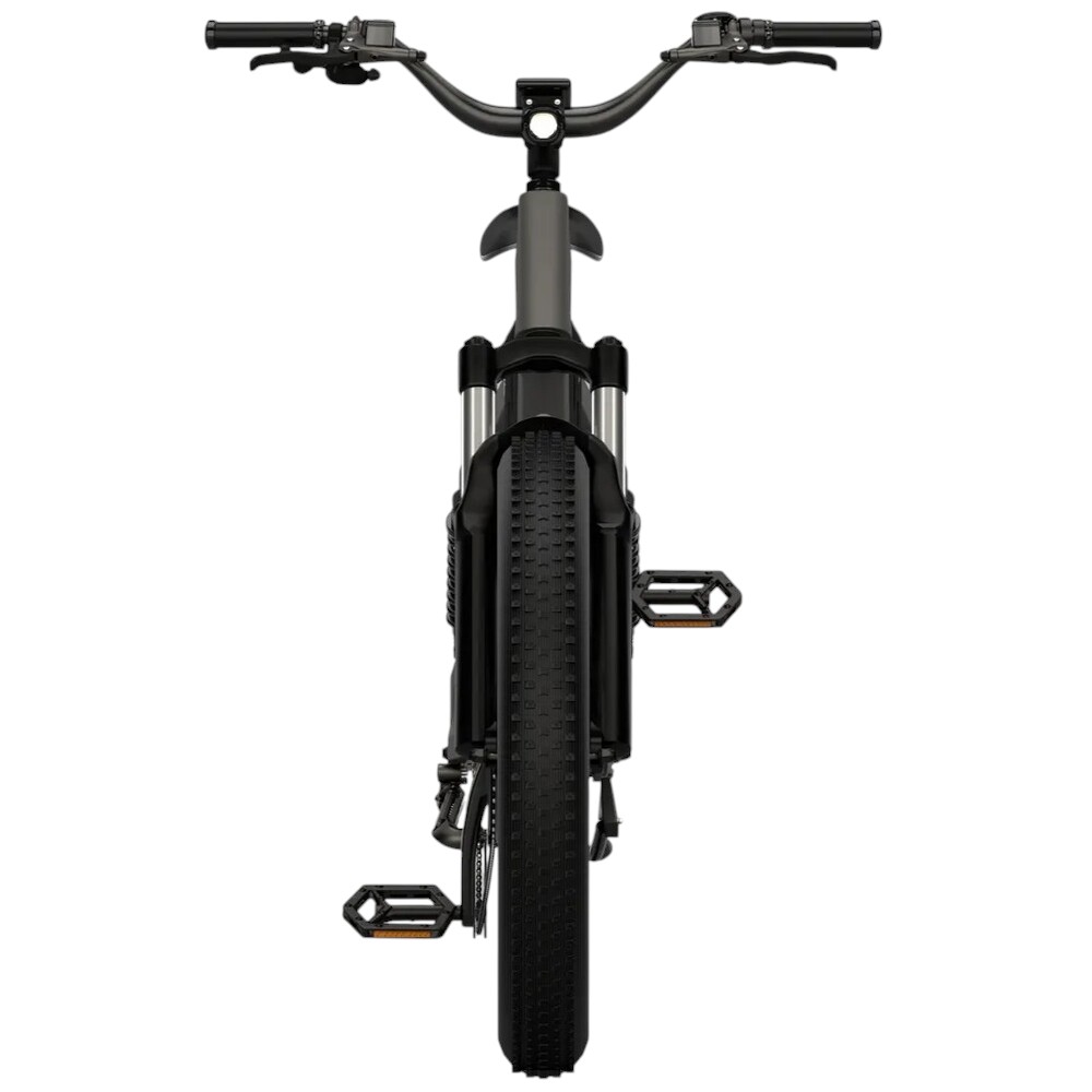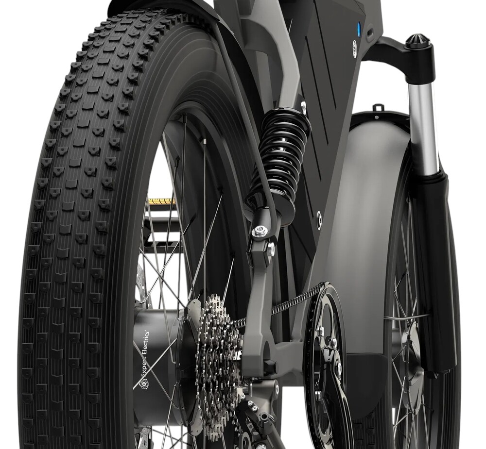 Рама изготовлена из прочного алюминия 6000 серии или авиационного алюминия, что обеспечивает лёгкий вес, высокую жёсткость и устойчивость к коррозии. Передние и задние амортизаторы эффективно смягчают удары, позволяя комфортно передвигаться по пересечённой, скалистой и грунтовой местности. Тормозная система — гидравлические дисковые тормоза с перфорированными дисками — обеспечивает мощное и безопасное торможение даже на высокой скорости.