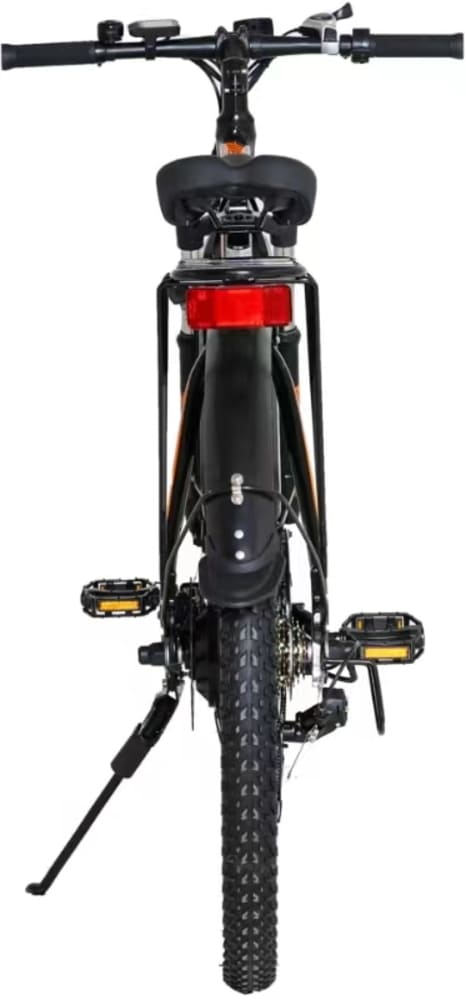 Велосипед выполнен в элегантном черном цвете с оранжевыми надписями, что придает ему современный и динамичный вид. Задний багажник позволяет удобно перевозить небольшие грузы или рюкзаки.