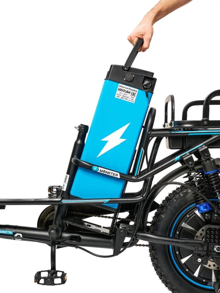 Электровелосипед оснащен аккумулятором типа Li-ion напряжением 60 В и ёмкостью 30 000 мА·ч, обеспечивающим увеличенный запас хода до 80 км на одном заряде. Полная зарядка занимает 8 часов, а съёмная батарея легко интегрируется в прочную низкую раму из алюминия, обеспечивая устойчивость и удобство посадки. Это делает поездки более комфортными, особенно для пользователей разного роста.