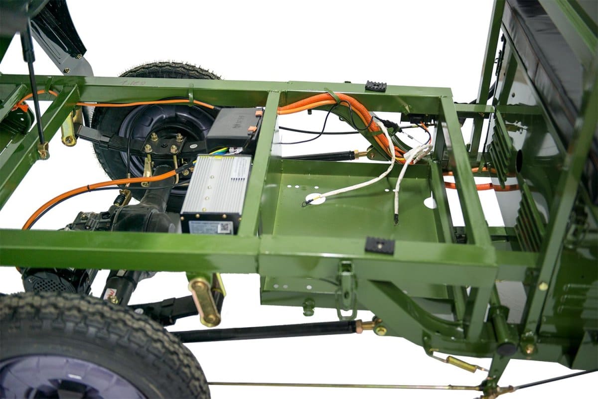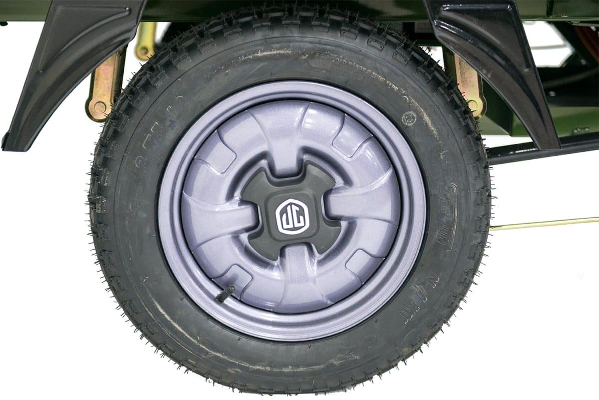 Для комфортной езды и устойчивости при перевозке грузов установлены пятилистовые рессоры сзади, эффективно смягчающие удары и обеспечивающие надёжную работу на неровных дорогах. Тормозная система — барабанные тормоза спереди и сзади — отличается долговечностью, простотой обслуживания и высокой эффективностью, особенно при частых остановках. Колёса диаметром 12 дюймов обеспечивают хорошую проходимость и маневренность даже в узких проходах.