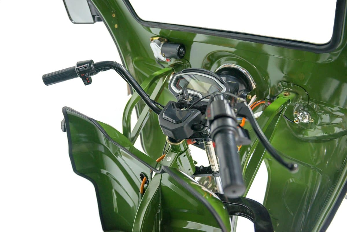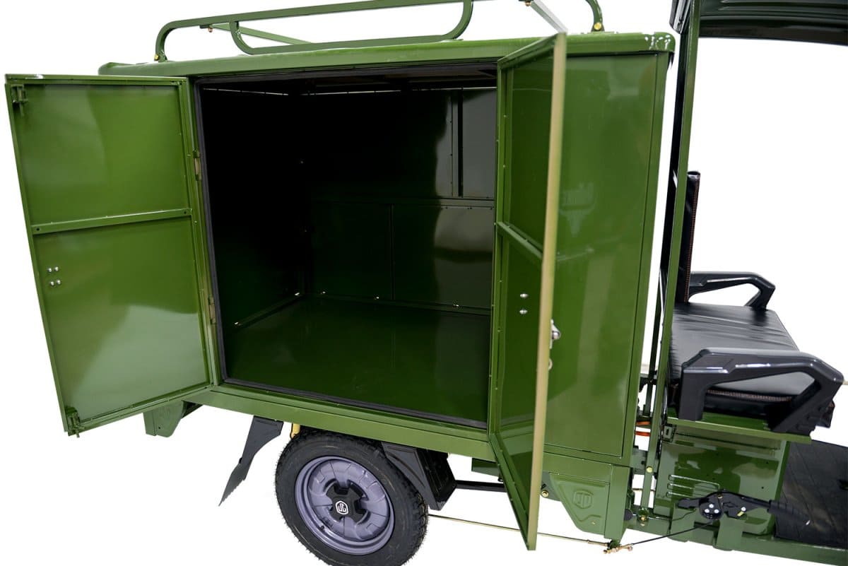 Электротрицикл работает от аккумулятора напряжением 60 В с возможностью выбора типа батареи: AGM VRLA, LiFePo4 или Li-Ion. Это позволяет подобрать оптимальное решение по стоимости, весу и автономности. Запас хода составляет до 60 км на одном заряде в зависимости от выбранной батареи и условий эксплуатации. Важно отметить, что аккумулятор не входит в комплект, что даёт пользователю гибкость при организации парка техники и систем зарядки.