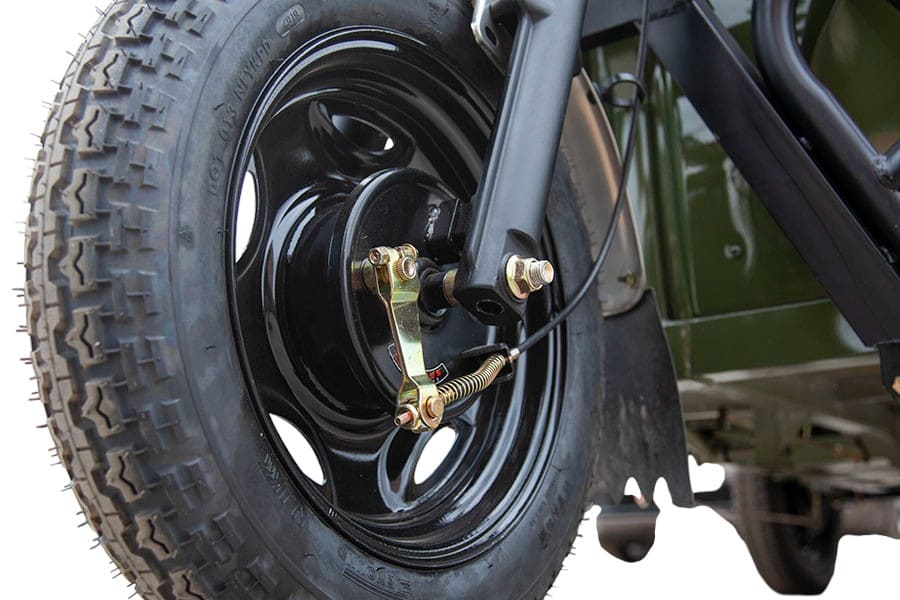 Для комфорта и устойчивости установлены усиленные 7-листовые рессоры заднего моста в сочетании с пружинами и гидравлическими амортизаторами, а спереди — новая широкая гидравлическая вилка, обеспечивающая плавность хода и лучшее сцепление. Тормозная система — барабанные тормоза спереди и сзади — гарантирует надёжное торможение под высокой нагрузкой. Удобное расположение рычагов (ручной тормоз и пониженная передача) на одной стороне руля упрощает управление и повышает безопасность.
