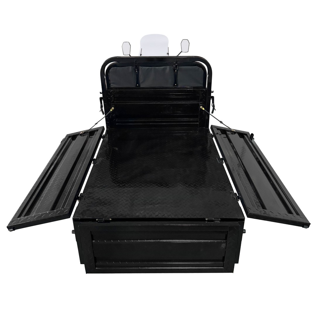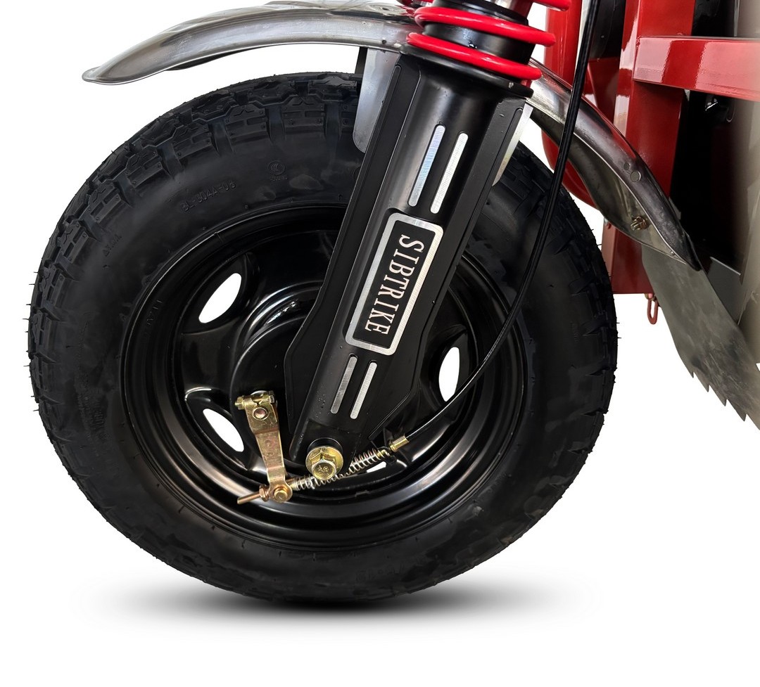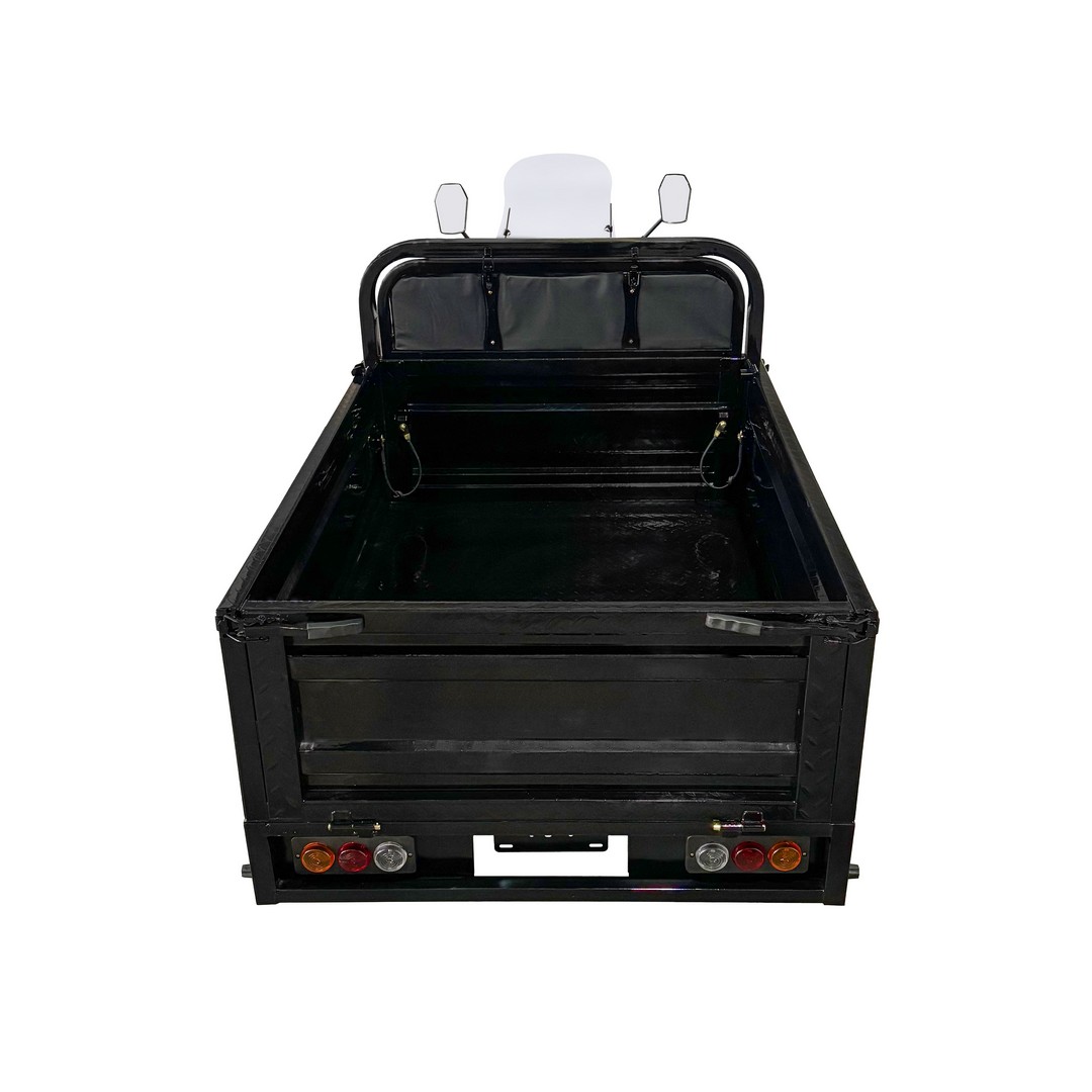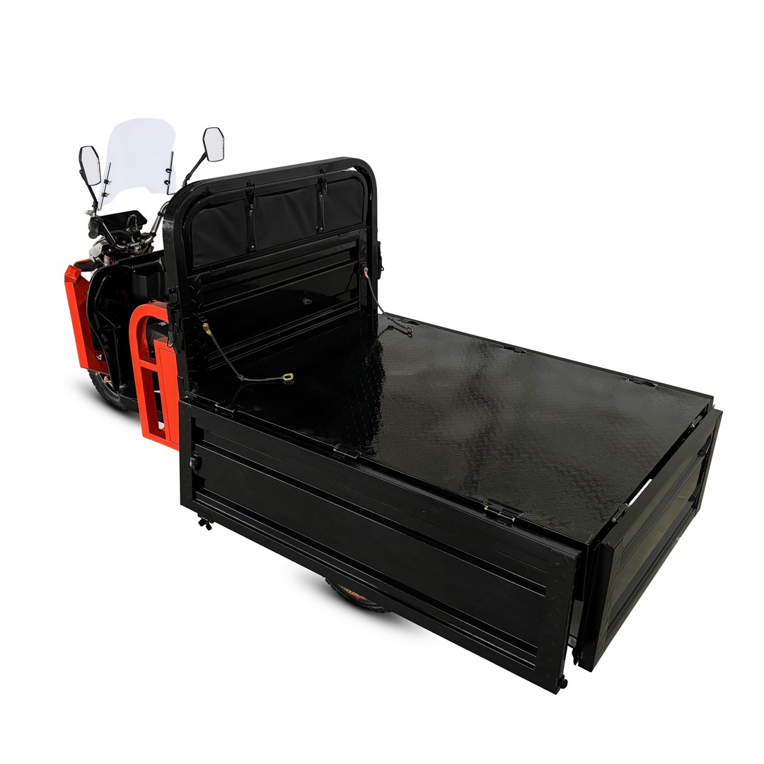 Грузовая платформа размером 1600×1100×470 мм выполнена из усиленного металла с четырьмя вертикальными рёбрами жёсткости и антискользящим покрытием пола. Борта — ребристые, цельные, откидываются на быстросъёмных петлях и фиксируются цепями, превращаясь в расширенную площадку для крупногабаритных грузов. Трицикл оснащён передними стробоскопическими фарами, повышающими видимость в темноте и плохую погоду, а также ветрозащитным стеклом и хромированным рулём для комфорта водителя.