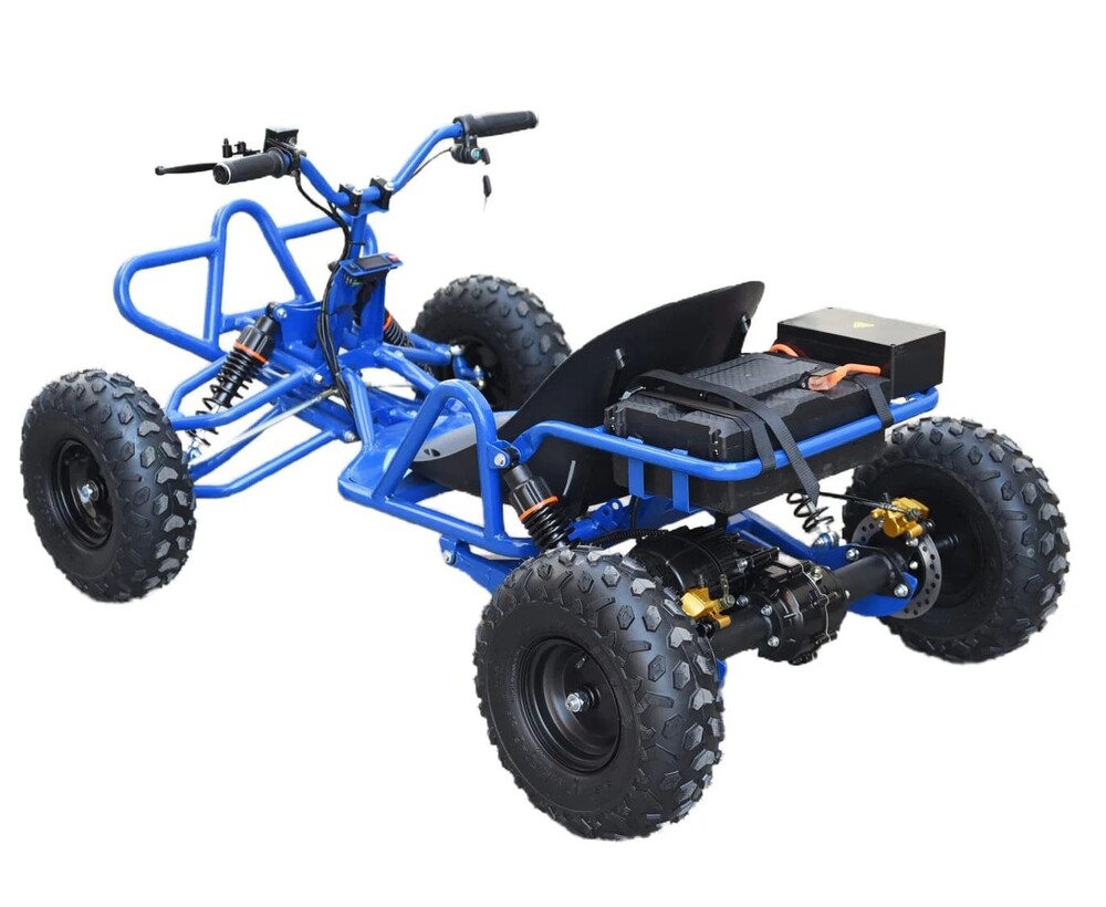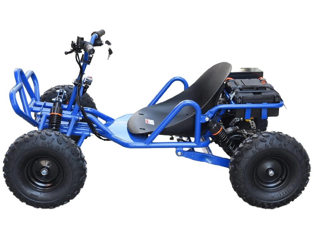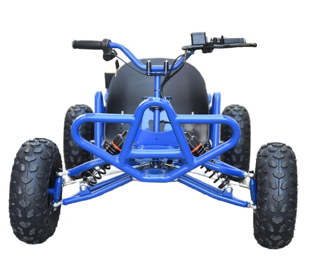 Электрокартинг работает от аккумулятора напряжением 48 В и емкостью 20 А·ч. Используется свинцово-кислотная батарея, которая обеспечивает стабильное питание и достаточную автономность для активного катания. Для безопасного торможения предусмотрен ручной дисковый тормоз на заднее колесо, что позволяет точно контролировать остановку даже на высокой скорости.