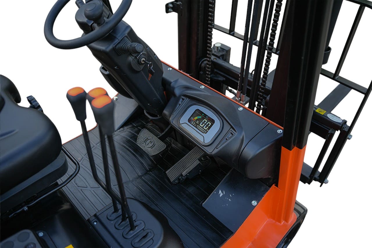 Погрузчик развивает скорость движения до 9,5 км/ч, скорость подъёма — до 220 мм/с, а опускания — 550 мм/с. Угол наклона мачты — 5° назад / 10° вперёд, что улучшает стабильность при транспортировке. Радиус поворота составляет 2200 мм, а ширина прохода для маневрирования — всего 3750 мм (для паллета 1000×1200 мм), что обеспечивает высокую маневренность даже в самых узких складских зонах.