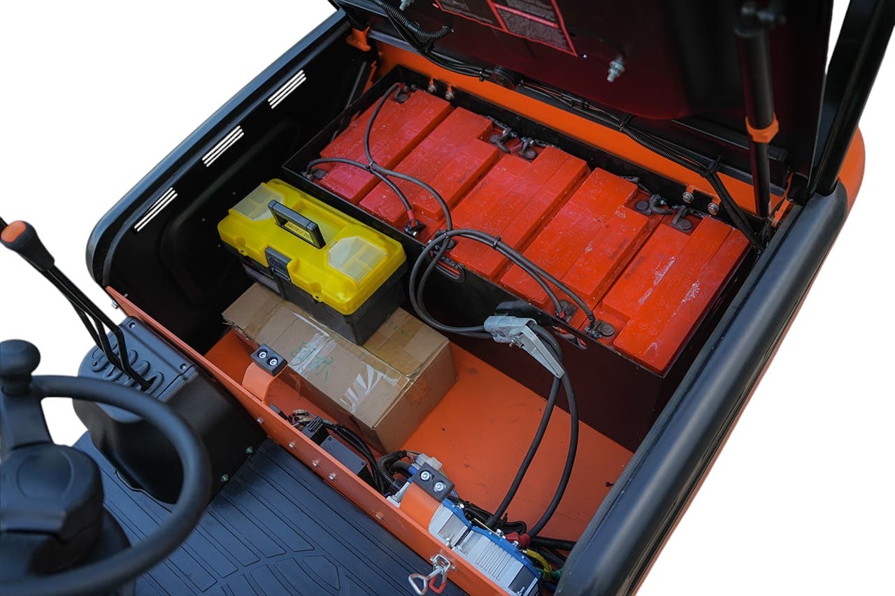 Погрузчик работает от свинцово-кислотного аккумулятора 60 В / 210 А·ч, который обеспечивает до 12 часов непрерывной работы без подзарядки. Вес батареи составляет 300 кг, что дополнительно повышает устойчивость машины. Технология быстрой зарядки и возможность установки дополнительных аккумуляторов минимизируют простои и увеличивают общую производительность в течение смены.