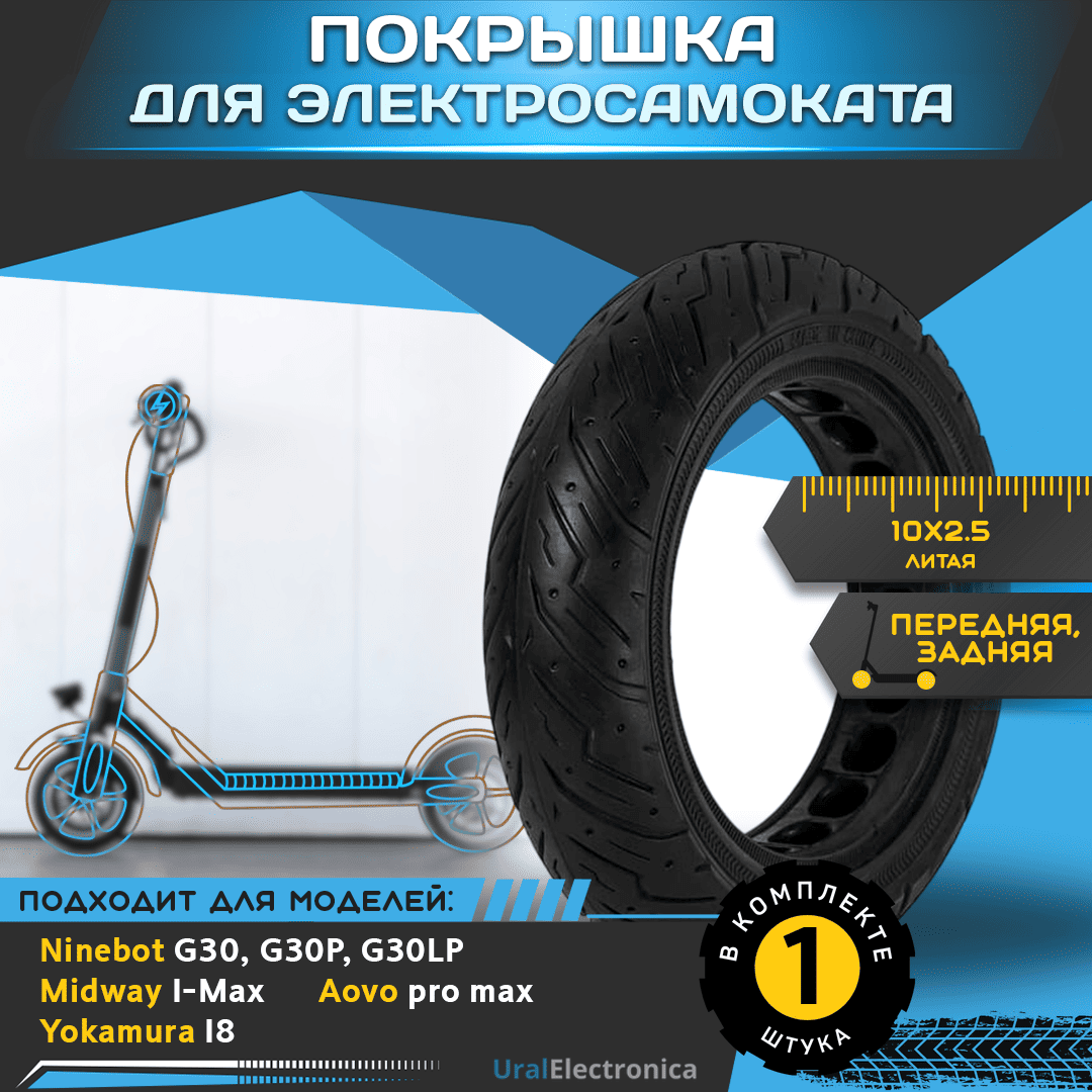 Покрышка 10x2.5 литая, предназначена для электросамоката Yokamura I8 / Ninebot G30, G30P, G30LP / Aovo pro max /Midway I-Max, а также любого другого электросамоката с аналогичным размером. Резина износостойкая и отличается долгим сроком службы. Бескамерная литая шина устойчива к проколам. Ее можно поставить один раз и навсегда забыть про шиномонтаж электросамоката.