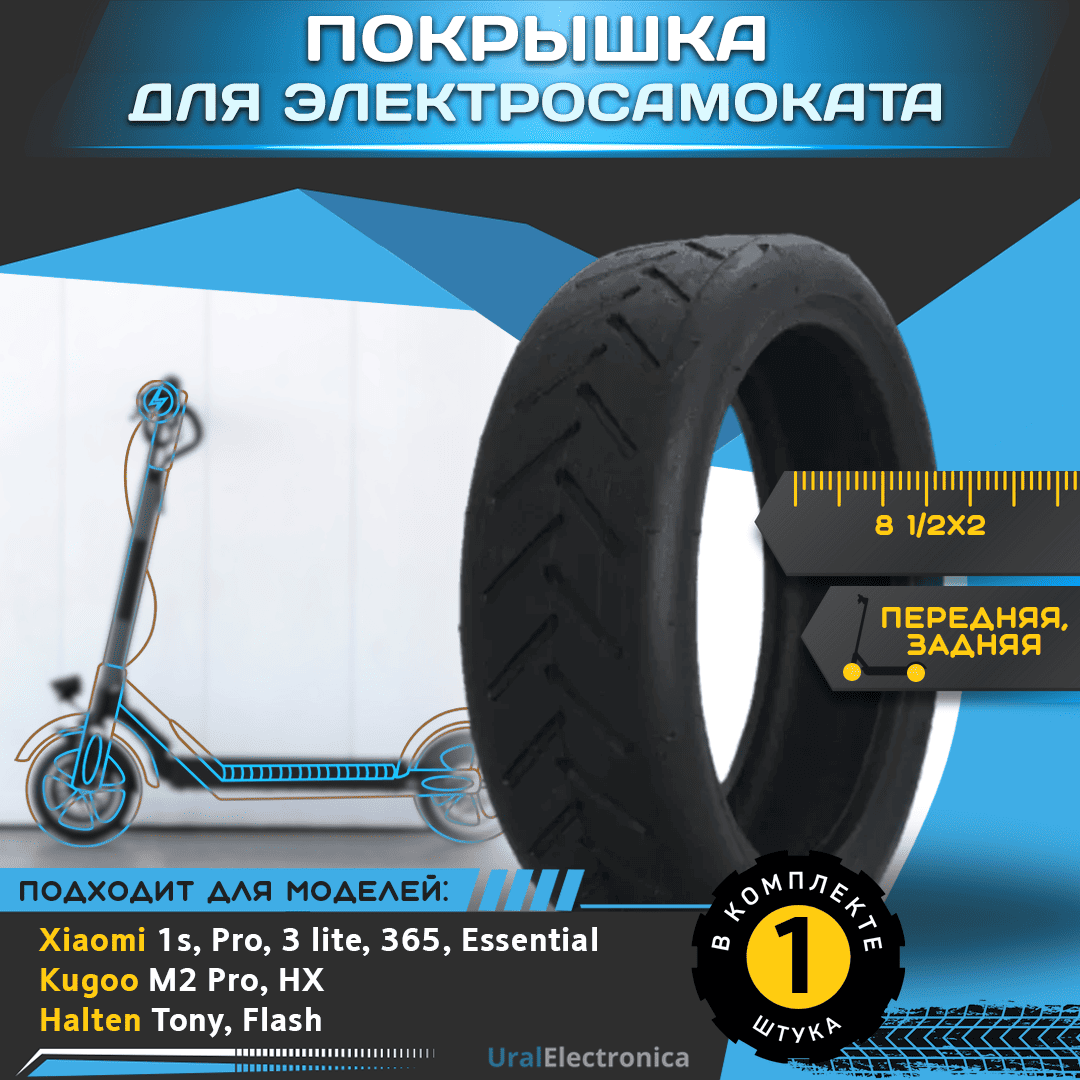 Покрышка 8 1/2х2, предназначена для электросамоката Xiaomi 1s, Pro, 3, 3 lite, 365, Essential / Kugoo M2 Pro, HX / Halten Tony, Flash / Aovo m365 Pro/ Midway Andy; а также любого другого электросамоката с аналогичным размером. Резина износостойкая и отличается долгим сроком службы. Данная покрышка обеспечит уверенное сцепление с поверхностью. Возможность установки на переднее и заднее колесо.